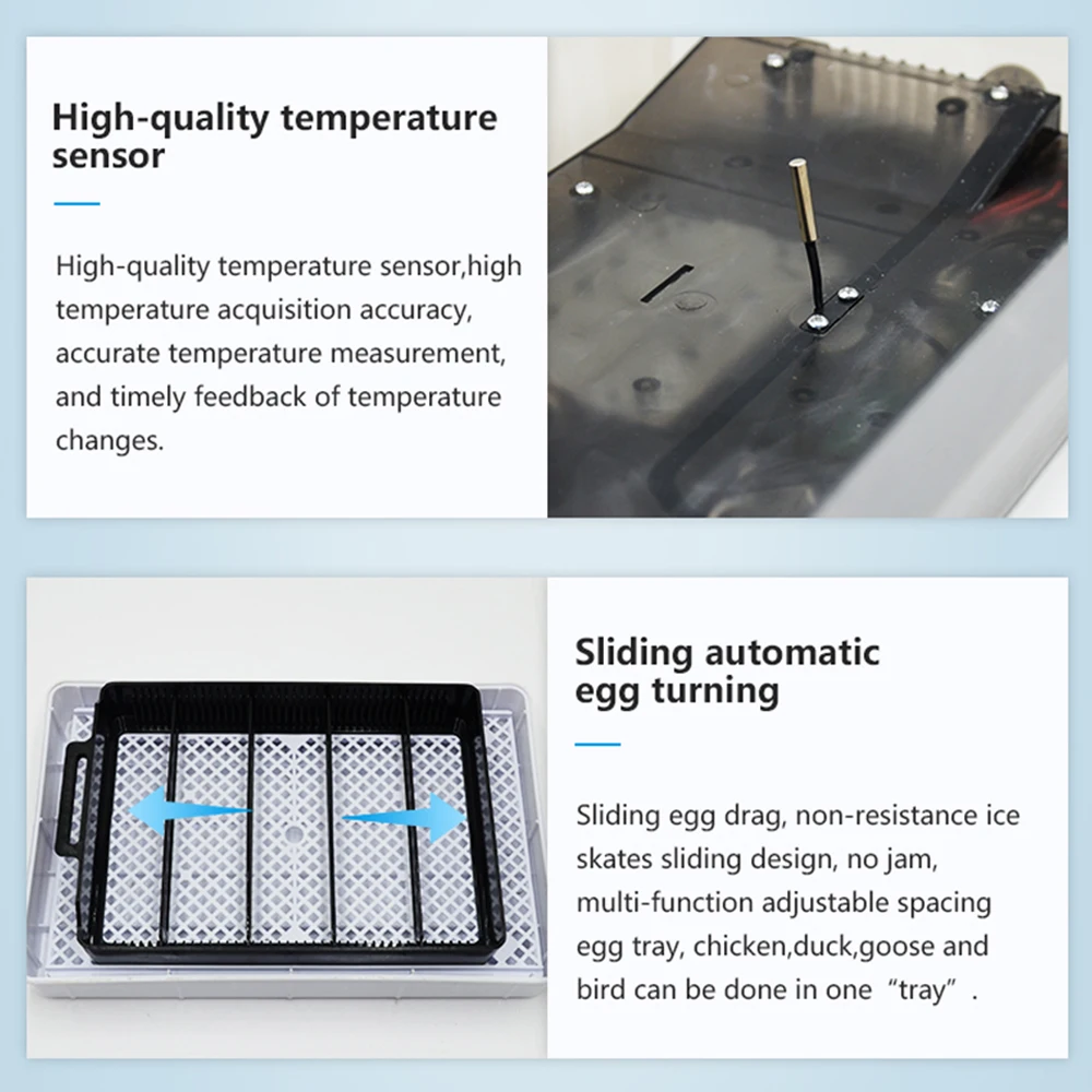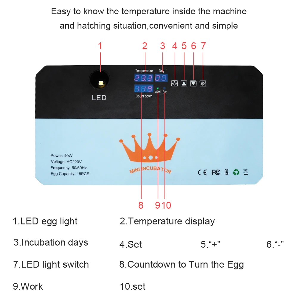 1. Простой в использовании-мини инкубатор для яиц может держать 15 яиц нормального размера и может инкубаровать несколько яиц одновременно; Цифровой дисплей четко показывает внутреннюю температуру для вас, чтобы контролировать, 4 кнопки управления, легко регулировать температуру и контролировать жизненную силу яиц