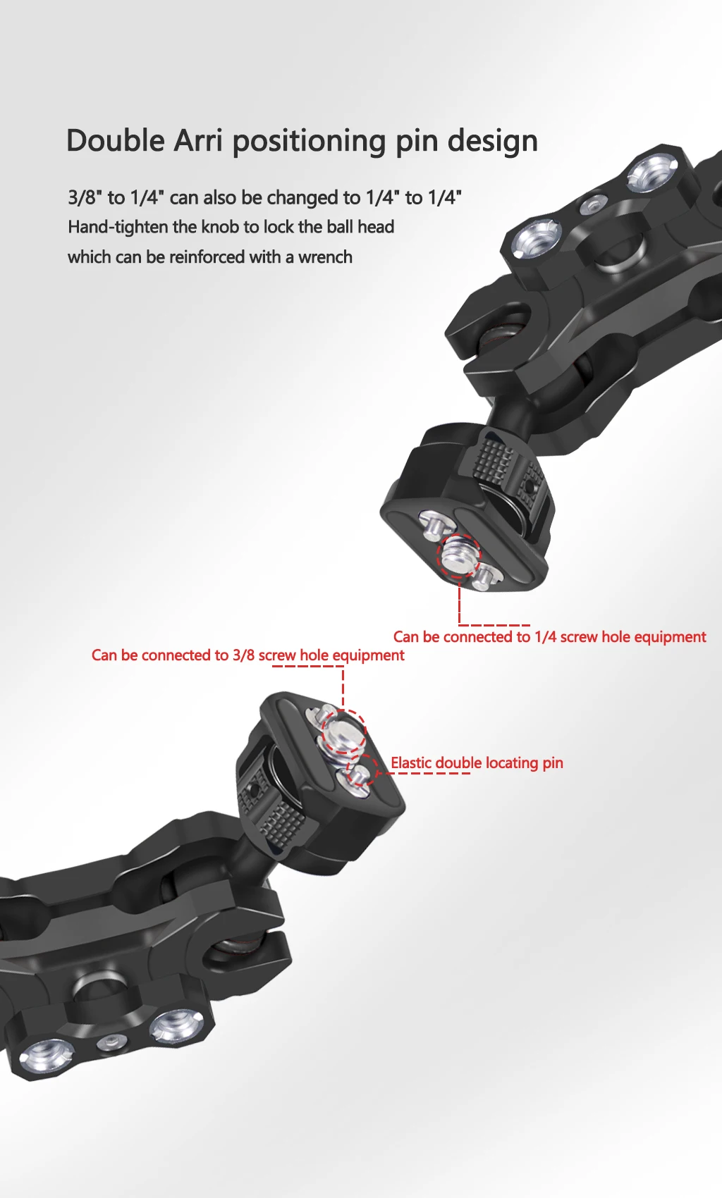 По сравнению с одним винтом 3/8 "-16 или 1/4"-20, винт ARRI locking гораздо безопаснее с двумя контактами против вращения. Обе Шаровые Головки закреплены с помощью одного большого рычага. Совместим с широким спектром устройств, таких как полевые мониторы, светодиодный свет, звуковая передача и т. д., этот рычаг имеет грузоподъемность до 5 кг/11 фунтов.