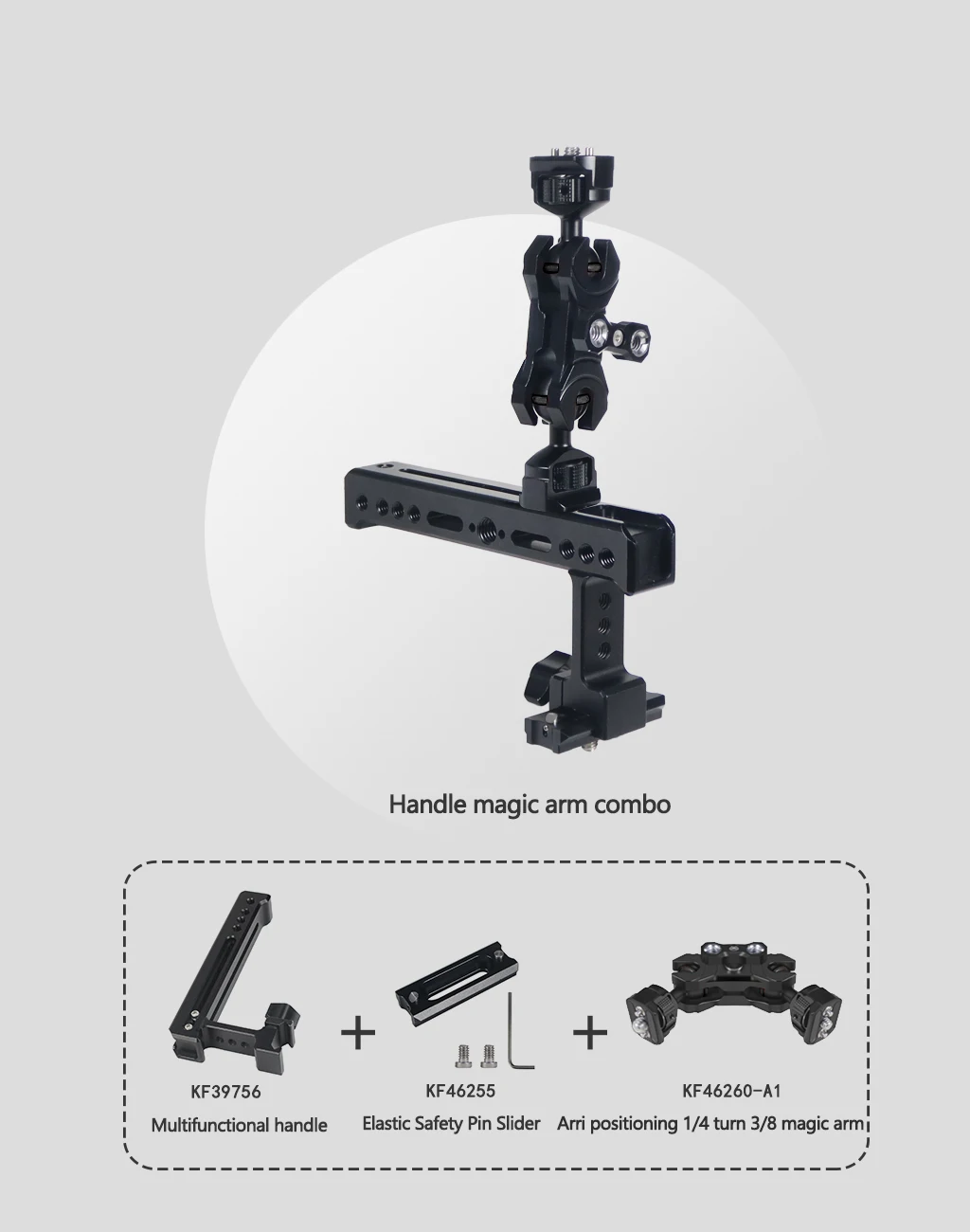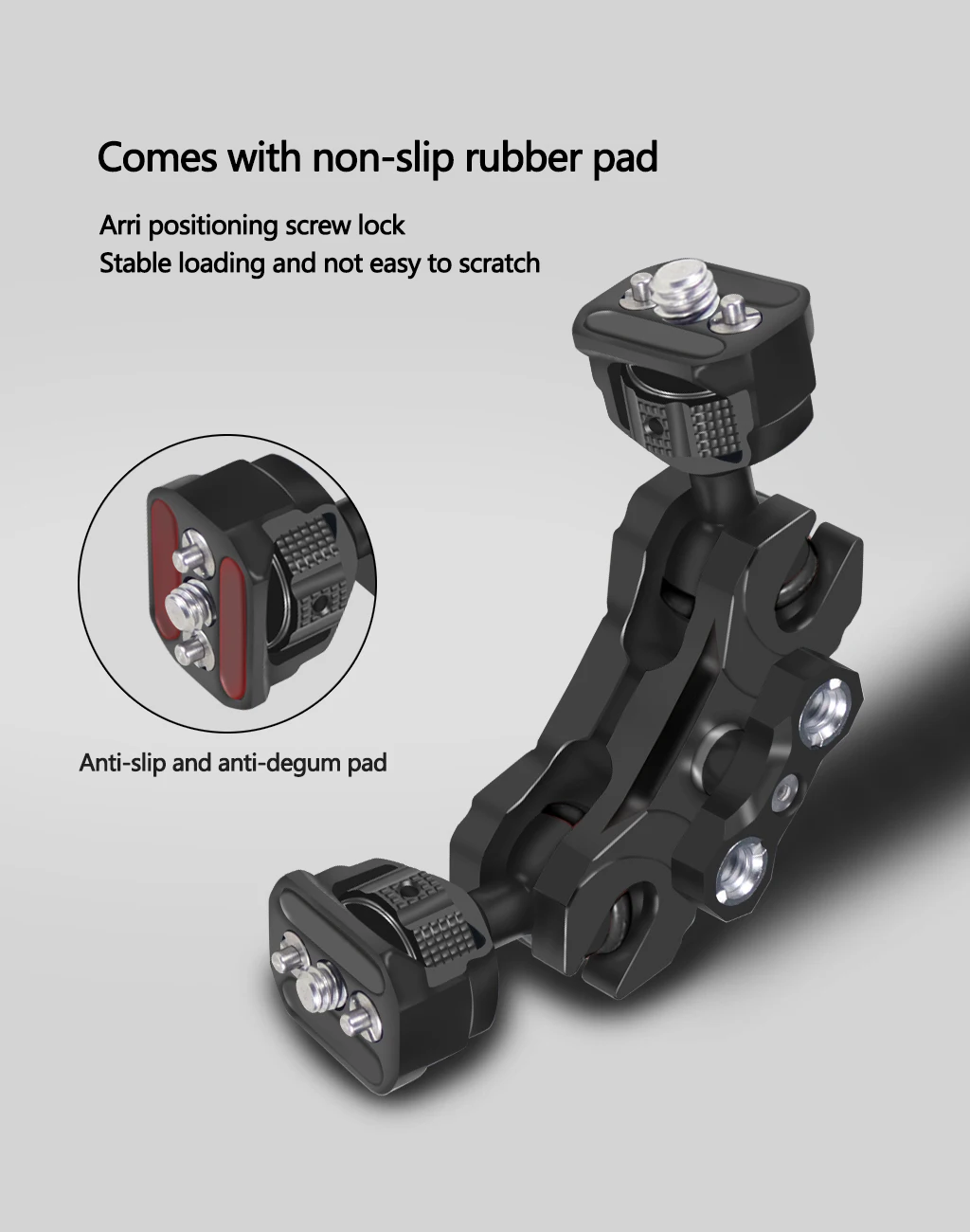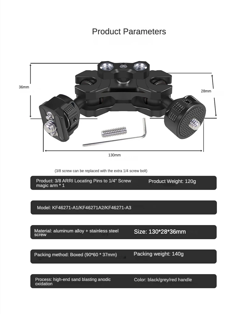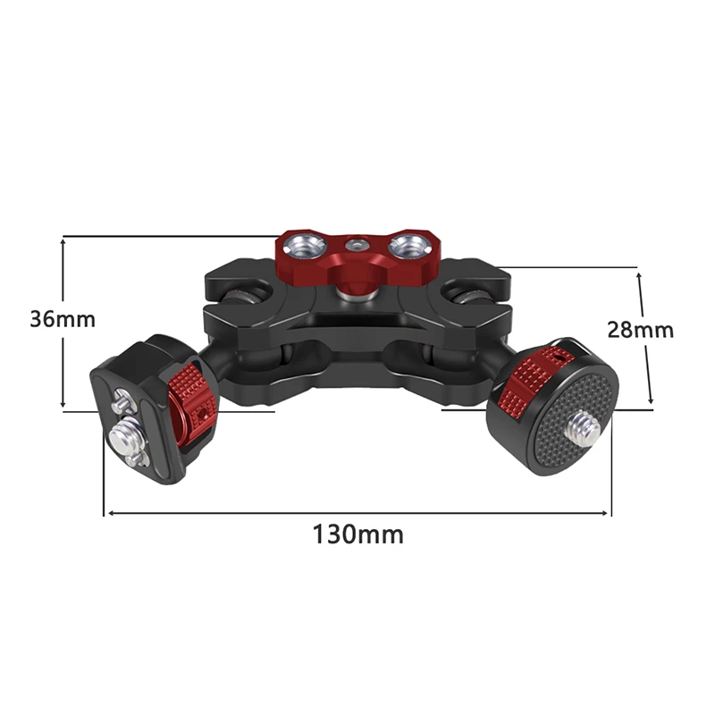 Новый продукт может быть использован для крепления аксессуара на вашей установке камеры прочно и гибко. Каждый конец имеет затягивающее колесо для легкого крепления аксессуаров, с резиновыми прокладками, защищающими оборудование от потертостей. Используйте прилагаемый маленький шестигранный ключ для дальнейшего затягивания большого пальца, если прилагается тяжелое устройство.
