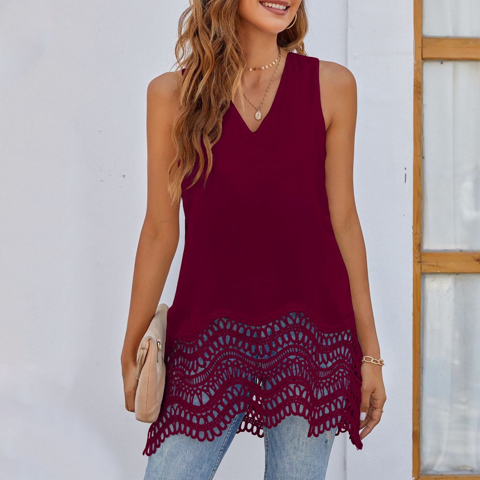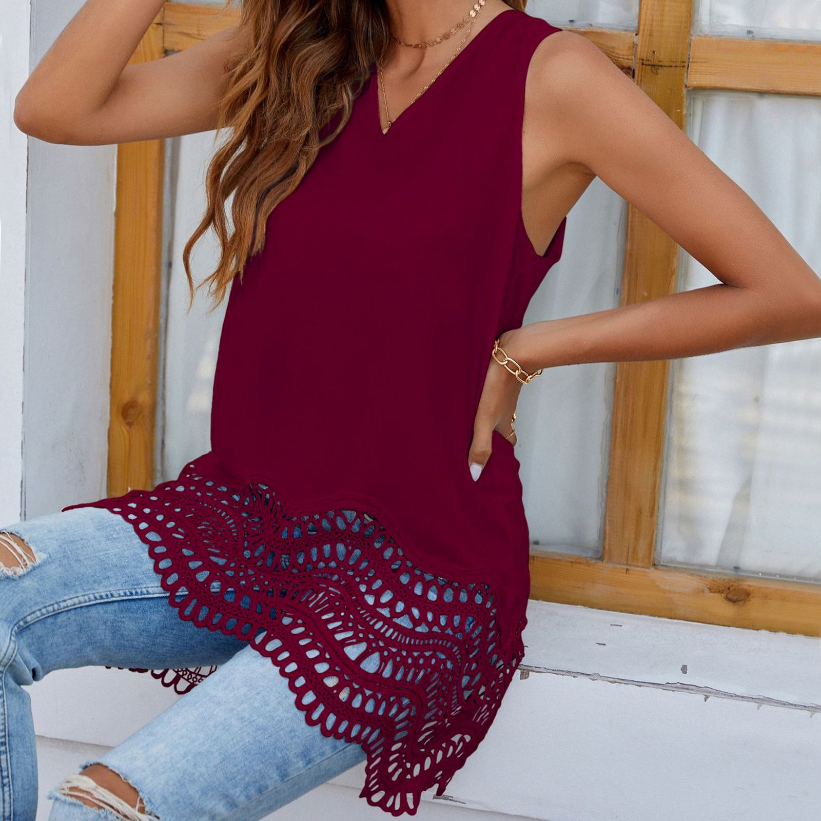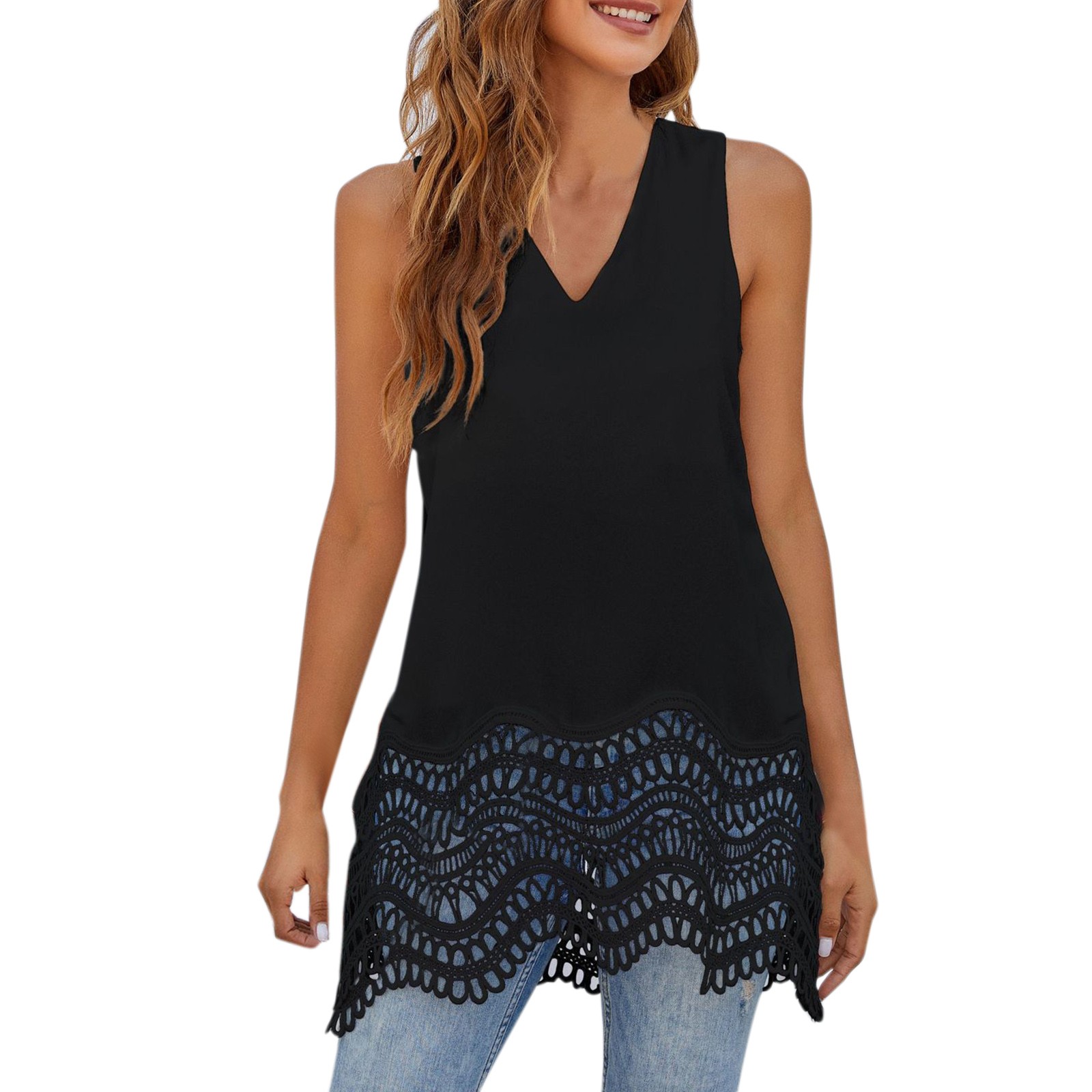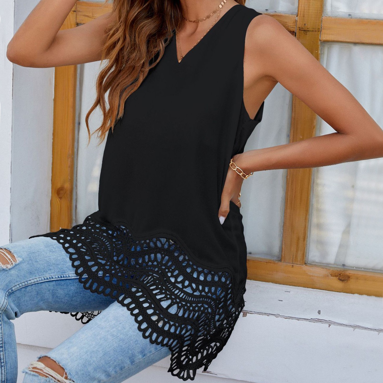 Этот кружевной шифоновый топ-майка с v-образным вырезом хорошо прикрывает живот и делает вас стройнее, отлично подходит для фотографирования.