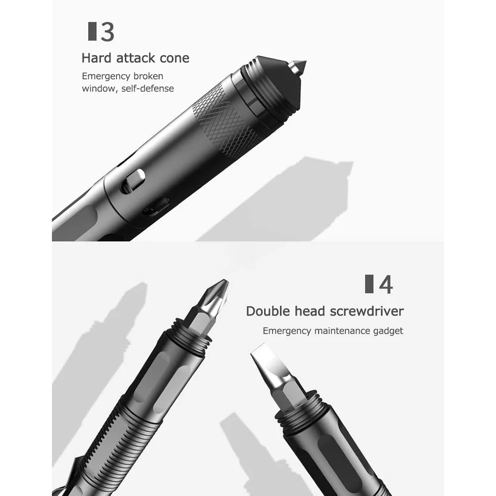 Feature: 1. Emergency lighting flashlight, LED lighting, telescopic focusing, lighting / flashing two modes. 2. Double-head screwdriver, emergency maintenance gadget. 3. Hidden whistle 4. Hide the bottle opener 5. Hard attack cone, emergency window breaking, self-defense 6. For emergency writing records, the cap is rotated and unscrewed, and the refill can be replaced. Specification: Material: aluminum alloy Color: Black Size: 176*15mm/7*0.6in Net weight: 55g Function: small flashlight, whistle, tungsten steel attack cone, double-head screwdriver, pen clip, bottle opener Note: Due to the different monitor and light effect, the actual color of the item might be slightly different from the color showed on the pictures. Thank you! Please allow 1-2cm measuring deviation due to manual measurement.