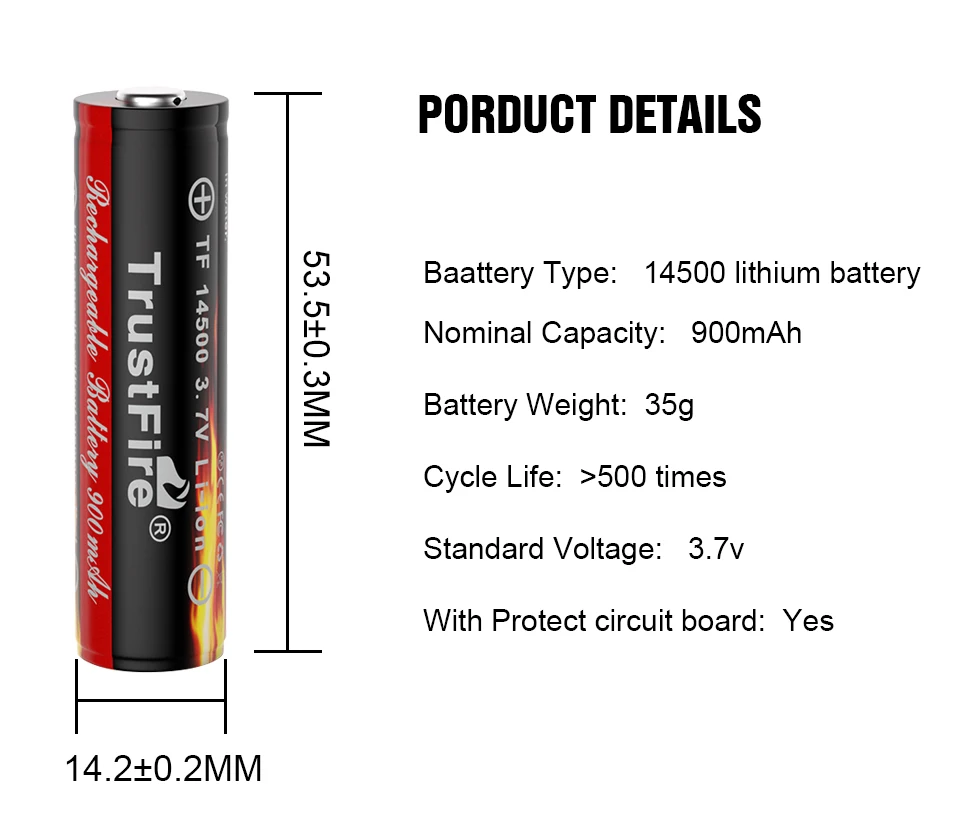 100% Trustfire 14500 литий ионный Батарея 3,7 V 900 мА/ч, Перезаряжаемые литий ниппель батареи с PCB для Мощность инструмент для е-байка игрушка-фонарик калькулятор.