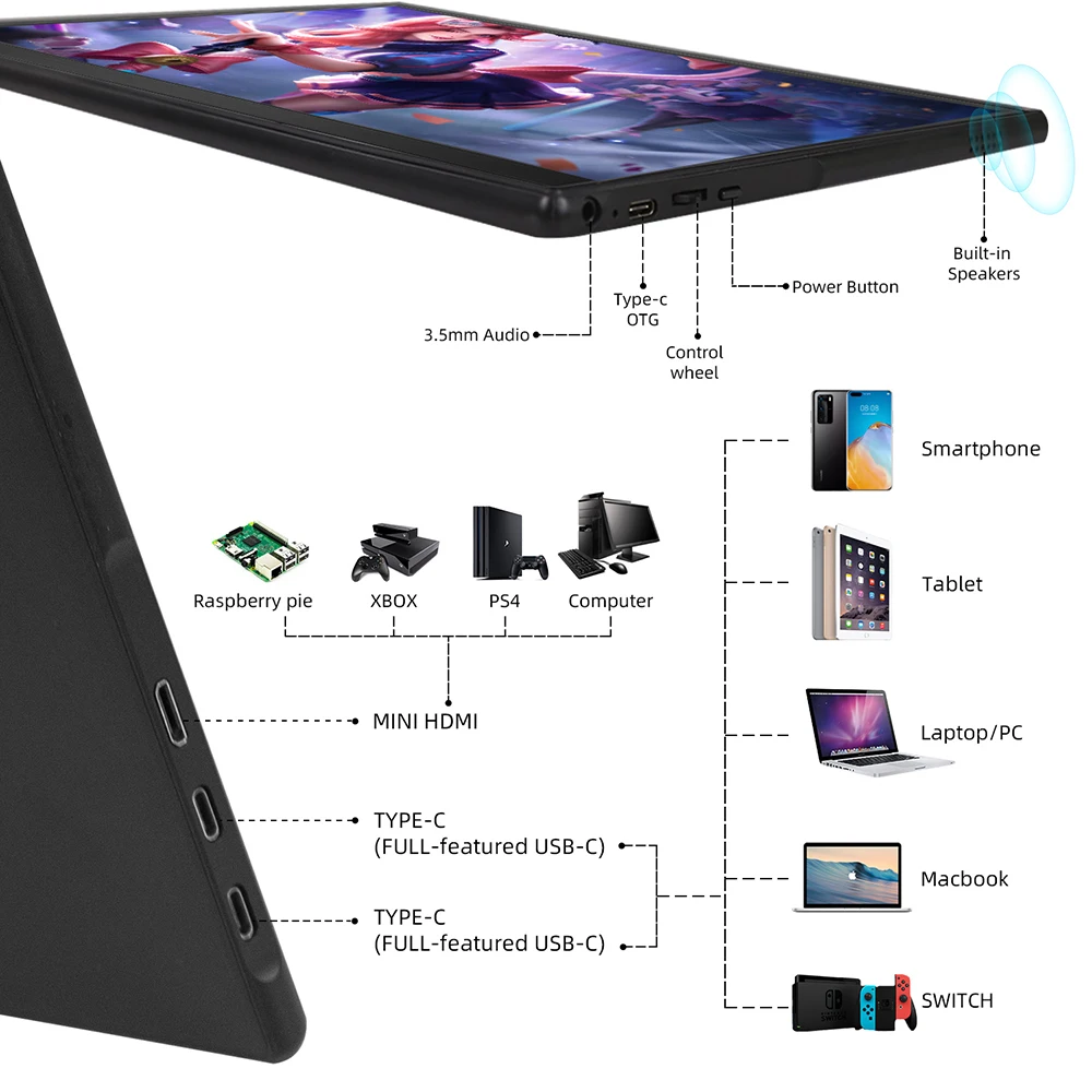 Портативный usb-монитор может легко подключаться к ноутбуку, ПК, MAC, планшету, смартфону, XBOX, PS3/PS4/PS5, переключателю и т. д. через порт Type-c или Mini HDMI, обеспечивает стабильное соединение и стабильную передачу данных. Отлично подходит для расширения экрана или игр в деловые поездки, путешествия или Домашние развлечения.
