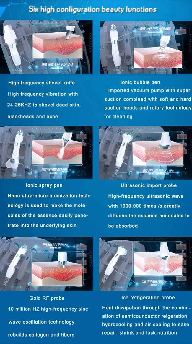 The intelligent ice blue skin management system is to collect facial skin detail images through 10 million pixel high-definition micro-range camera combined with three-spectral imaging technology, through intelligent diagnosis and analysis of artificial intelligence core engine ,8 dimension fine items to detect skin problems, and according to the diagnosis results of private customized beauty care program and intelligent recommendation of professional skin care products; Combined with the techniques of" ultrasonic shovel knife "," bubble "," nano atomization "," ultrasonic wave "," gold radio frequency "," ice repair "and so on, the six high configuration beauty functions comprehensively manage the skin, combine the results of AI skin diagnosis with skin care products and other skin care items, and develop a multi-functional integrated equipment for skin detection and management.