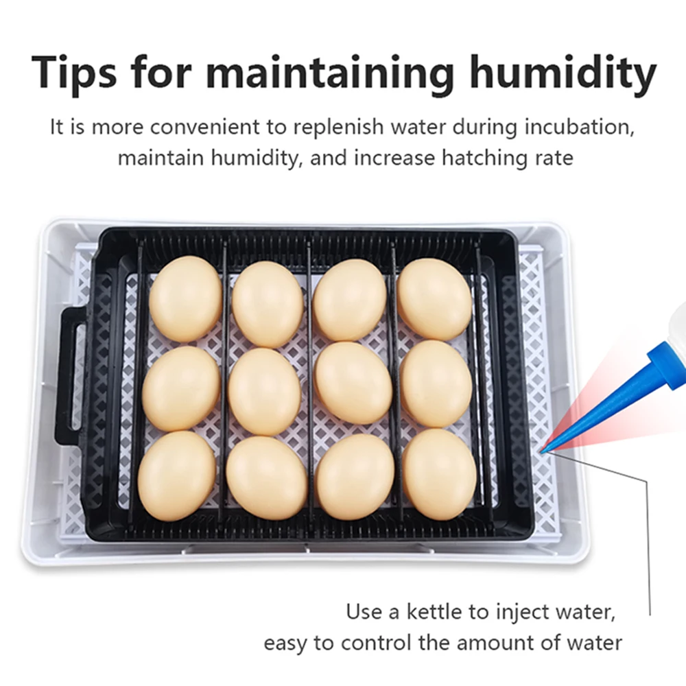 Incubator egg capacity: 12 eggs/9 duck eggs/35 bird eggs/4 goose eggs