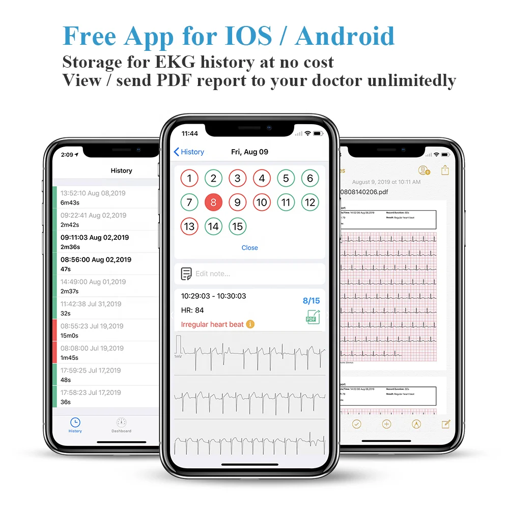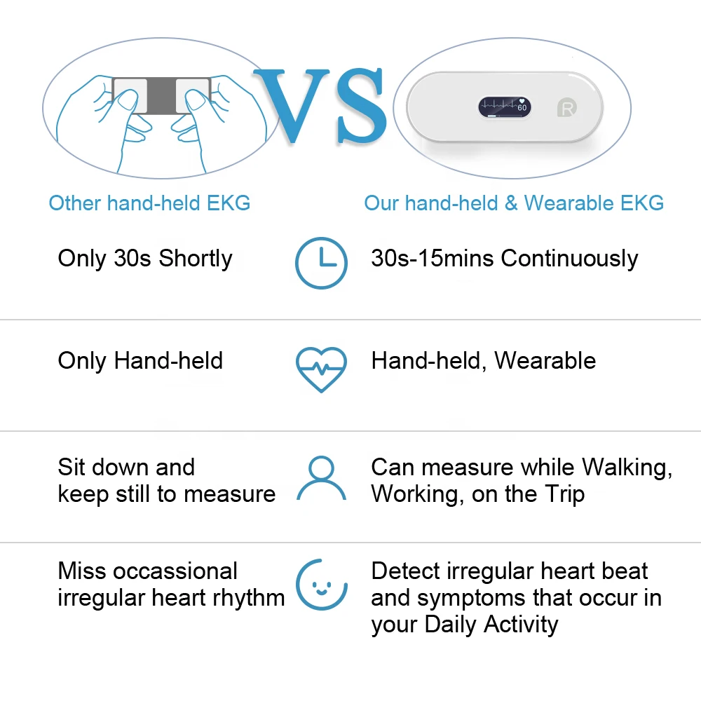 Ультра-светильник, персональный прибор для наблюдения за сердцем, вы можете записывать ваше сердцебиение от 30 с до 15 минут, совместимо как с ручным прикосновением, так и с технологией ношения. Он прост в использовании и дружелюбен для тех людей, которые беспокоятся о своем здоровье сердца или семье, имеющих историю проблем с сердцем. Отчеты можно просмотреть или поделиться с вашим врачом в формате PDF для вашего плана диагностики и лечения.