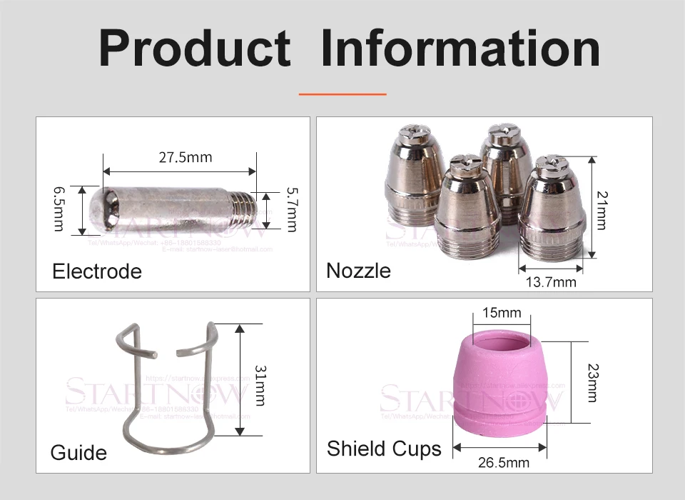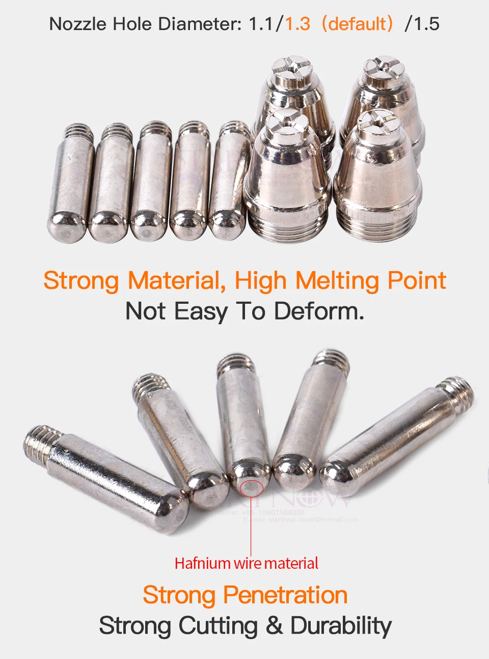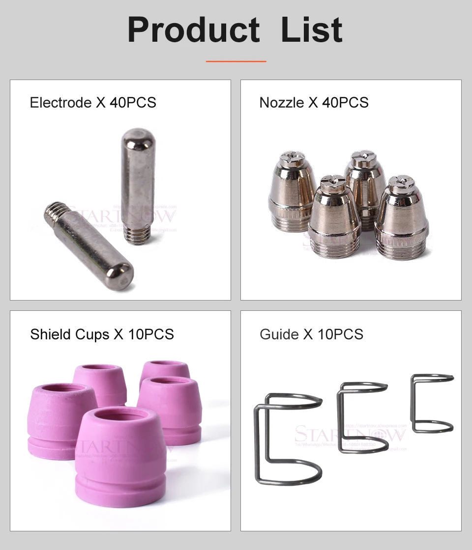 MOQ:1 Set includes 40pcsNozzle+40pcsElectrode+10pcsShield Cups+10pcsPlasma torch guide Material:Nozzle Copper(galvanized),Electrode Hafnium wire ,Shield Cups CeramicNote:Nozzle diameter default 1.3mm,if you need 1.1mm, 1.5mm, Please Consult Customer Service~Other models please click here.Смотрите так же другие товары: