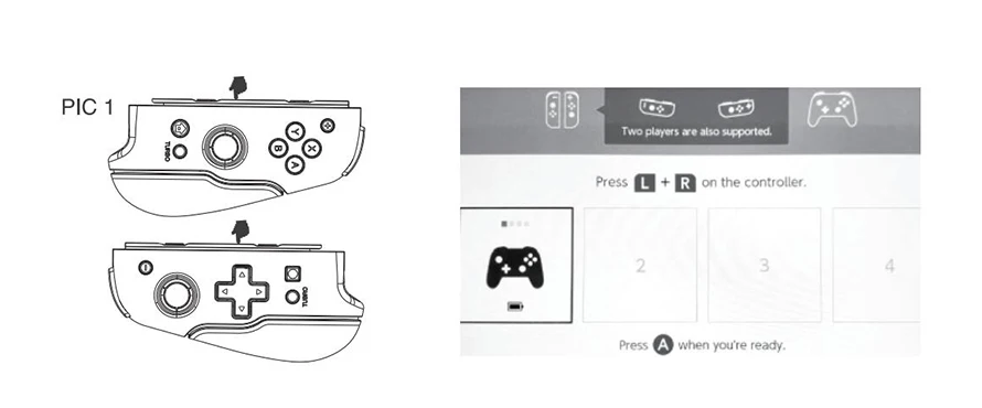 Когда геймпад выключится, нажмите кнопку «пара» в течение 2 секунд, чтобы включить режим поиска пары геймпада, светодиодный геймпад начал работать с мигающими огнями, когда всегда включен один или несколько светодиодный gameapd и консоль сопряжены с поиском успеха, N-S экран консоли появляется с двумя серыми шагами вращения, Затем нажмите левую и правую кнопку геймпада L и R вместе, N-S экран консоли серый геймпад станет черным геймпадом, Нажмите A, чтобы завершить сопряжение и нажмите HOME, чтобы выйти из интерфейса.