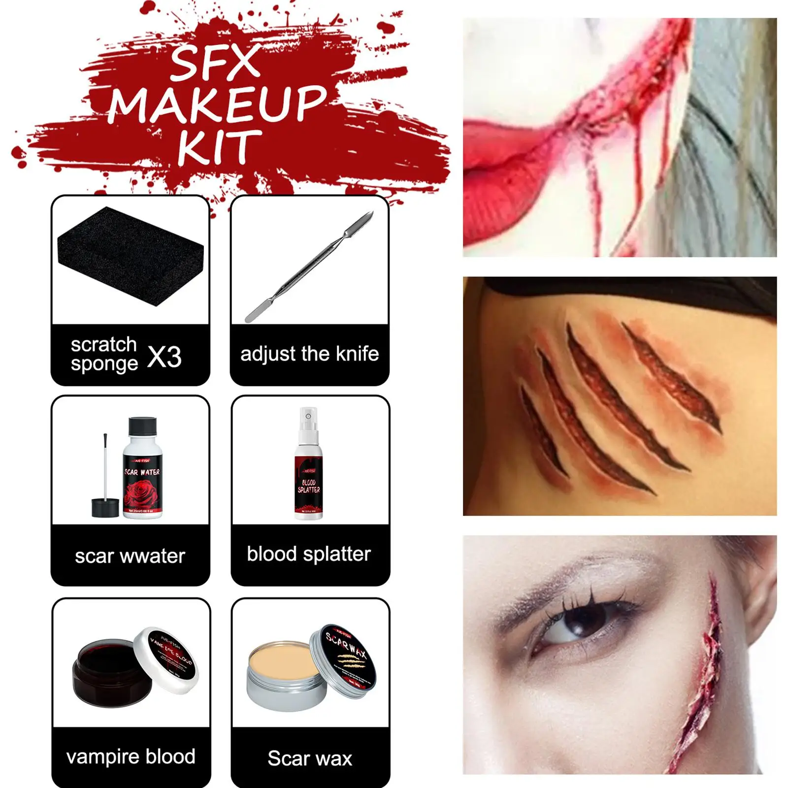 Характеристики: воск для шрамов + поддельный гель для крови + шрамовая вода + поддельный спрей для крови + губка * 3 + серебряный скребок