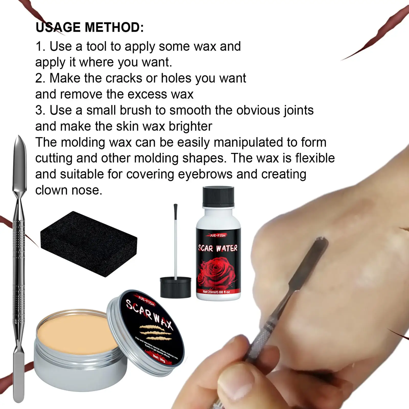 1. Эффект макияжа: вы можете использовать наш набор воска для макияжа для достижения реалистичных эффектов. Вы можете создавать хорошие результаты, такие как ожоги, большие раны, порезы, шрамы, укусы и т. д. легко создавать порезы и деформации или другие формы, такие как строительство носа клоуна.