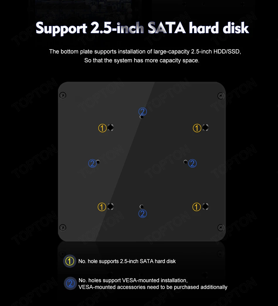 -Низкое потребление TDP только 10 Вт и может быть установлен на задней части монитора с помощью кронштейна VESA (опционально).