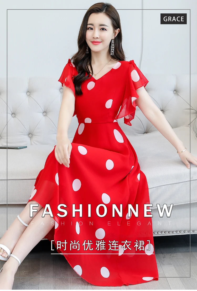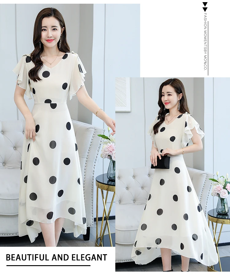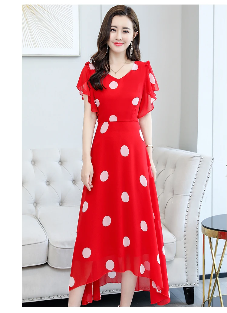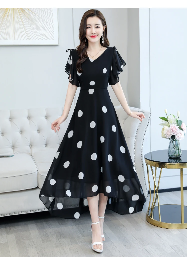 TingYiLi Women's V-neck Flutter-Sleeve High-Low Polka Dot Dress Summer Black White Red Boho Chiffon Midi Long Dress Korean Style