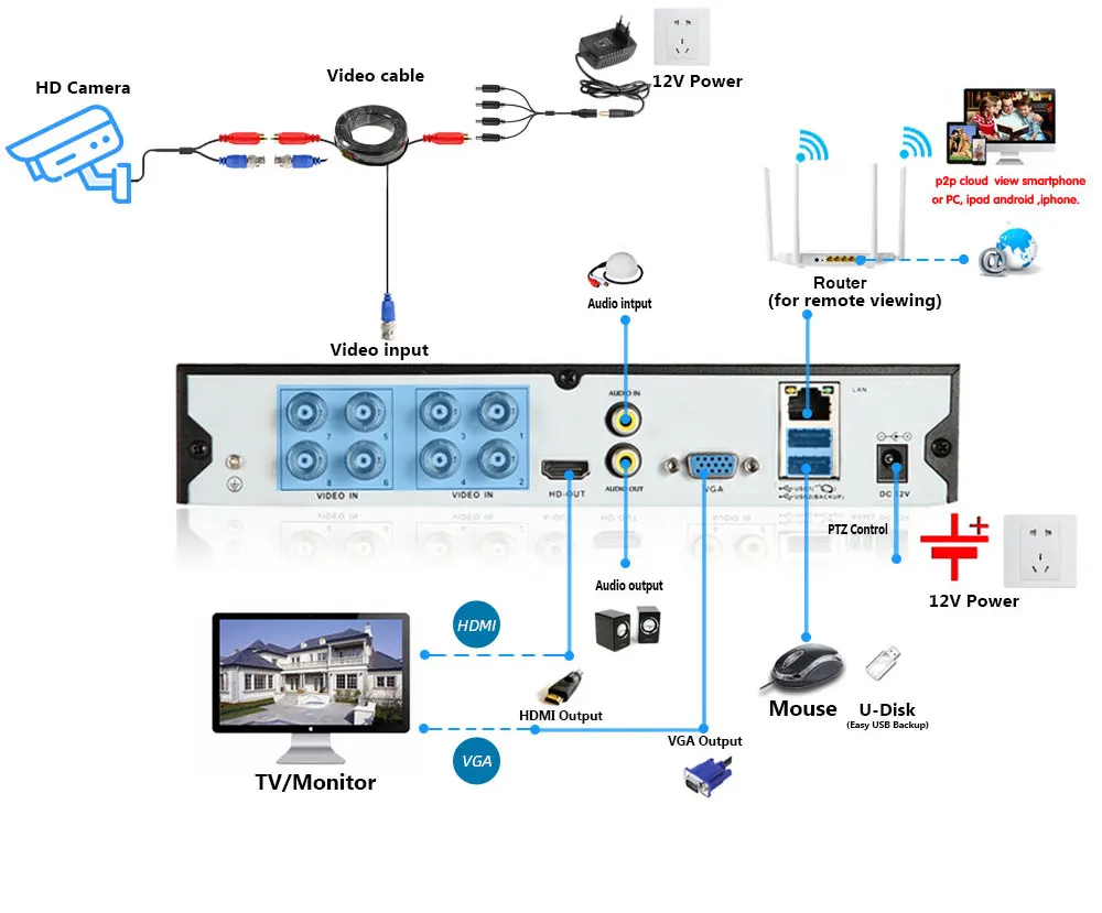 Простая настройка, всего 4 шага для просмотра мобильный телефон, просмотра видео в режиме реального времени из любого места и в любое время с помощью смартфона, стола или ПК с передовой технологией P2P, вы можете получить удаленный доступ к вашей системе за считанные минуты или меньше, нет необходимости в переадресации, удаленный доступ никогда не был таким простым!
