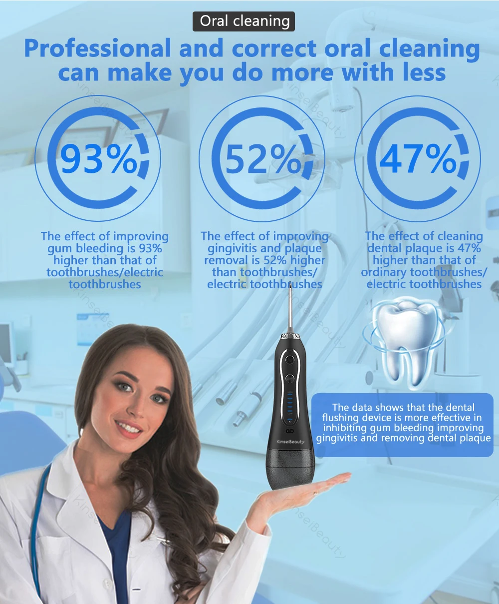Компактный, портативный и легкий дизайн, его легко носить во время путешествий. Специальный съемный резервуар для воды, легко заполняется и очищается. Низкий уровень шума, система управления одним касанием с 5 регулируемыми режимами очистки. Водяная нить отлично подходит для общего ухода за зубами, может удалить до 99.9% налета на обработанном Области. Кроме того, поплавки воды на 5X эффективнее, чем струнные поплавки, отлично подходят для эффективного орошения полости рта, чистки зубов, предотвращения пародонтита и других заболеваний гумлайна, И для очищения носа для удаления синусита и аллергического ринита.