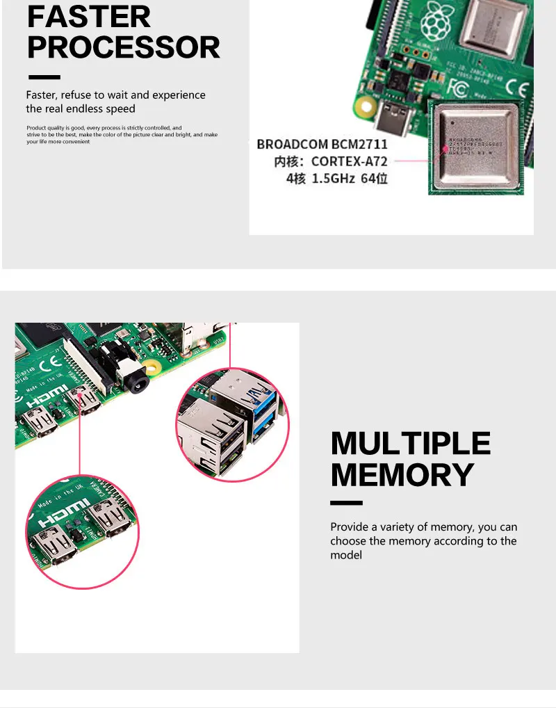 1. Broadcom BCM2711, Quad core Cortex-A72 (ARM v8), 64-разрядная SoC @ 1,5 ГГц