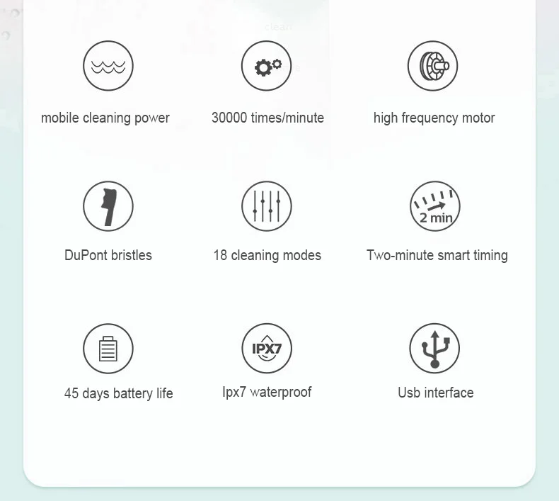 5. 2-мин Автоматическое выключение: электрическая зубная щетка поддерживает автоматическое выключение времени. После постоянной чистки зубов в течение 2 минут зубная щетка автоматически отключится,