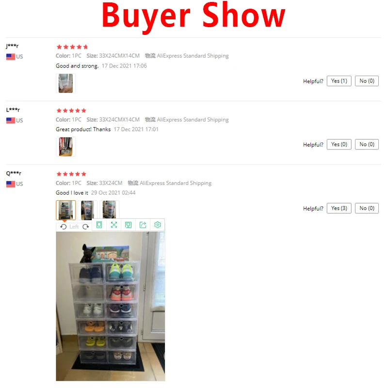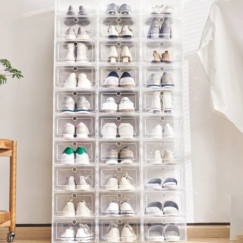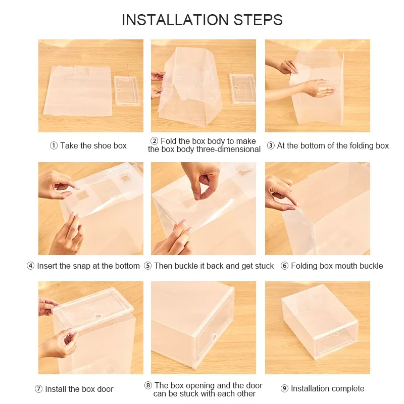 Size: 31*21*12cm/33*23*14cmColor: whiteMaterial: PPPackage includes:1/6 x shoe boxFeatures:** Application: Suitable for storing shoes up to size 40 (not recommend for sneaker) / Suitable for storing shoes up to size 44 (not recommend for high shoes)** Practical and convenient: Keep your shoes dust free and neatly organized with stackable shoe box storage bin** Clear front design: Clear front design lets you find shoes immediately without opening, the front door can easily open grab and go.** Stackable: Stackable design to help maximize your space** Breathable: The ventilation ensures air circulation and odor prevention, breathable shoe containers stay fresh** Easy to use: With snap-tight clasp design, you can put the shoe storage box together** Widely used: Ideal for closets, bedrooms, bathrooms, laundry rooms, craft rooms, mudrooms, offices, garages, or any room of your home / apartment and more.** Good quality material: Made from good quality PP plastic, good quality material ensures durability.** Clean: Easy daily care, convenient to clean.Notes:1. Please allowed 1-3mm differences due to manual measurement, thank you for your understanding!2. Due to the difference between different monitors, please understand that the picture may not reflect the actual color of the item. Installation tutorial ![]()