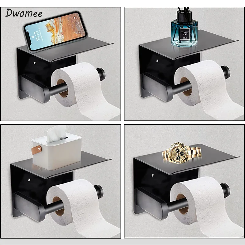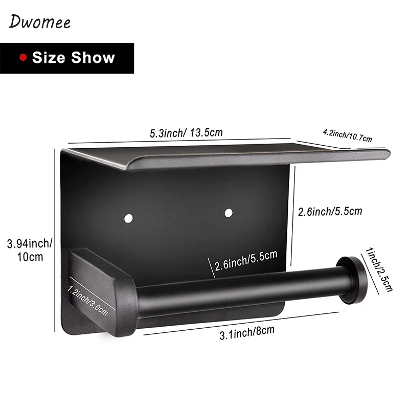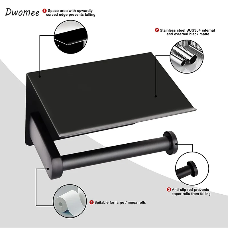 Self adhesive toilet paper holder is made of SUS304 stainless steel, sleek and modern, with a durable rust proof surface, easy to wipe clean with a damp cloth. Dwomee tissue paper holder has matte black finish, eco-friendly paint, smooth surface, simple and elegant appearance, without sharp edges.