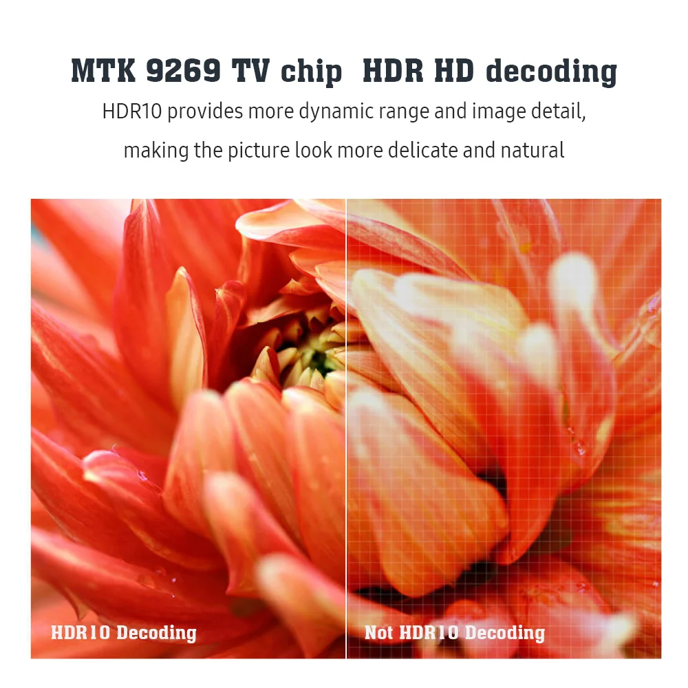 [MTK 9269 TV chip,HDR HD декодирование] HDR10 обеспечивает более динамический диапазон и детализацию изображения, делая изображение более тонким и естественным.