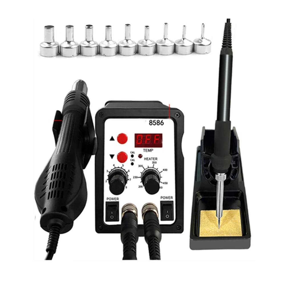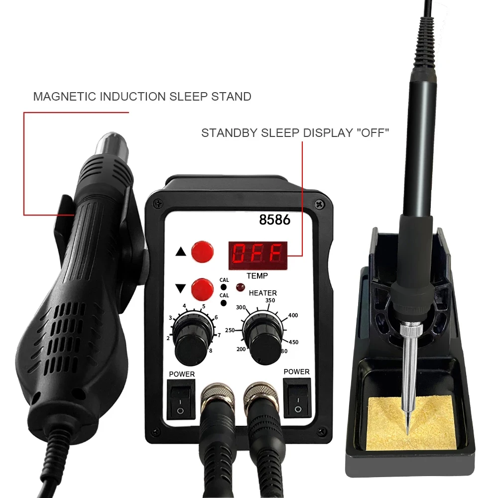 Это совершенно новая паяльная станция 2 в 1 SMD 8586. Металлический корпус из сплава с высококачественным силиконовым корпусом отличается элегантным внешним видом и энергосбережением. Вы можете использовать пистолет горячего воздуха и паяльник отдельно, без помех друг с другом.