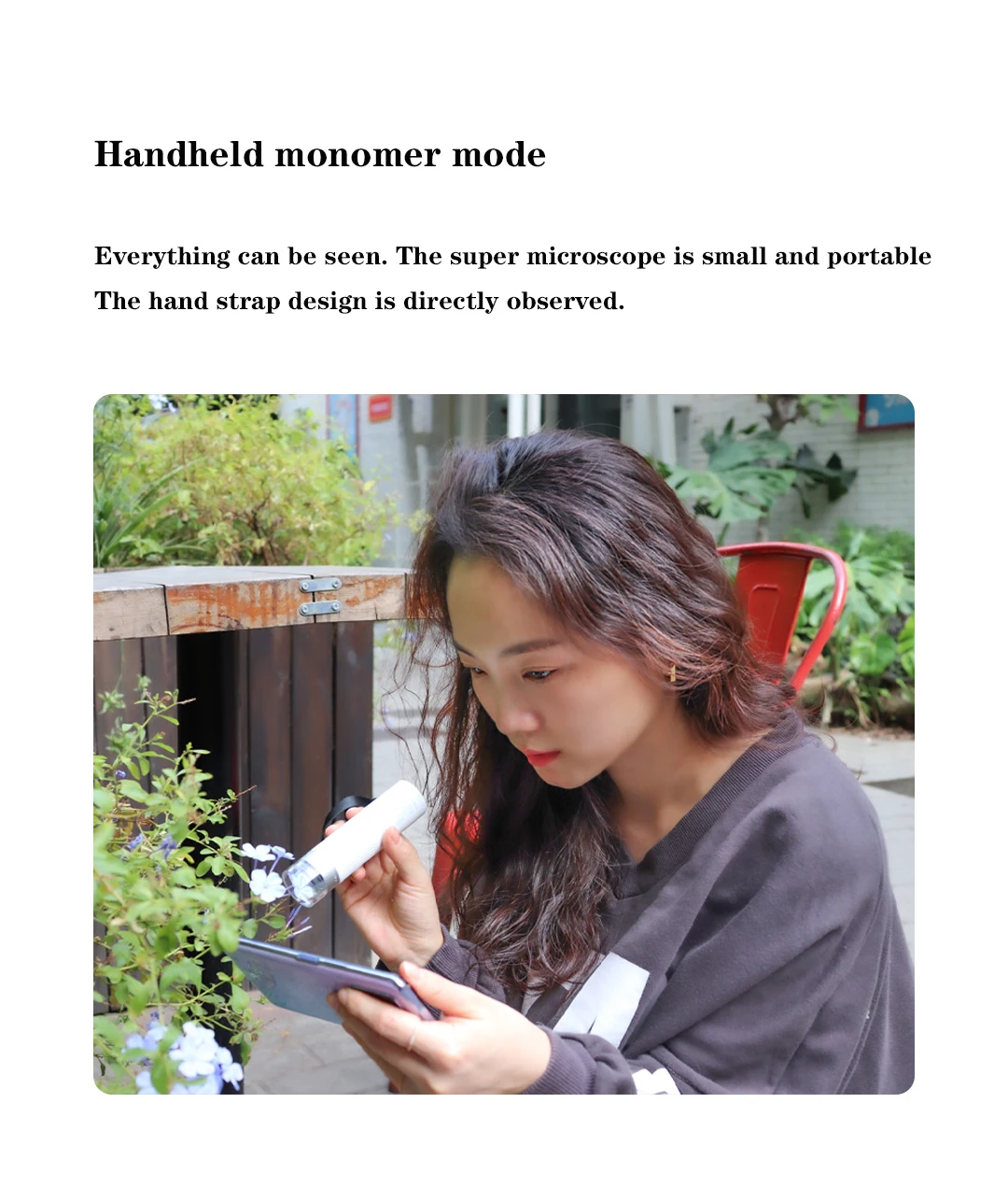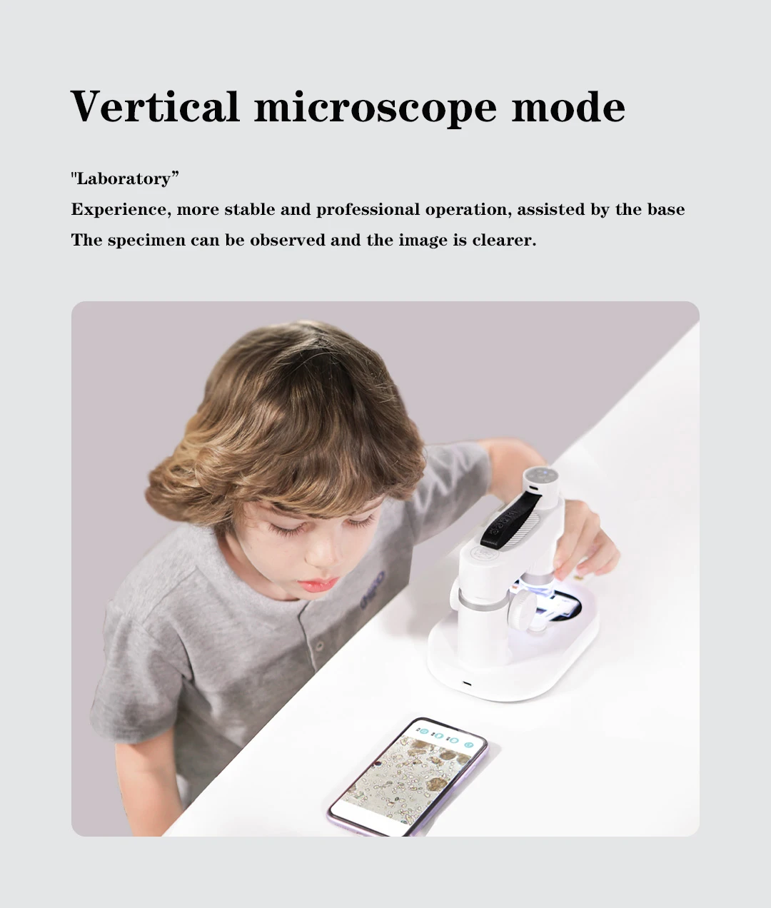 Два в одном раздельном дизайне, один ручной светильник такой же, как 100 г, и портативное наблюдение не ограничено; В сочетании с базой он становится вертикальным микроскопом за считанные секунды, И работа более стабильная и профессиональная. Вертикальный режим микроскопа «лабораторный» опыт, работа более стабильная и профессиональная, основание может помочь наблюдать за образцом, и изображение более четкое.