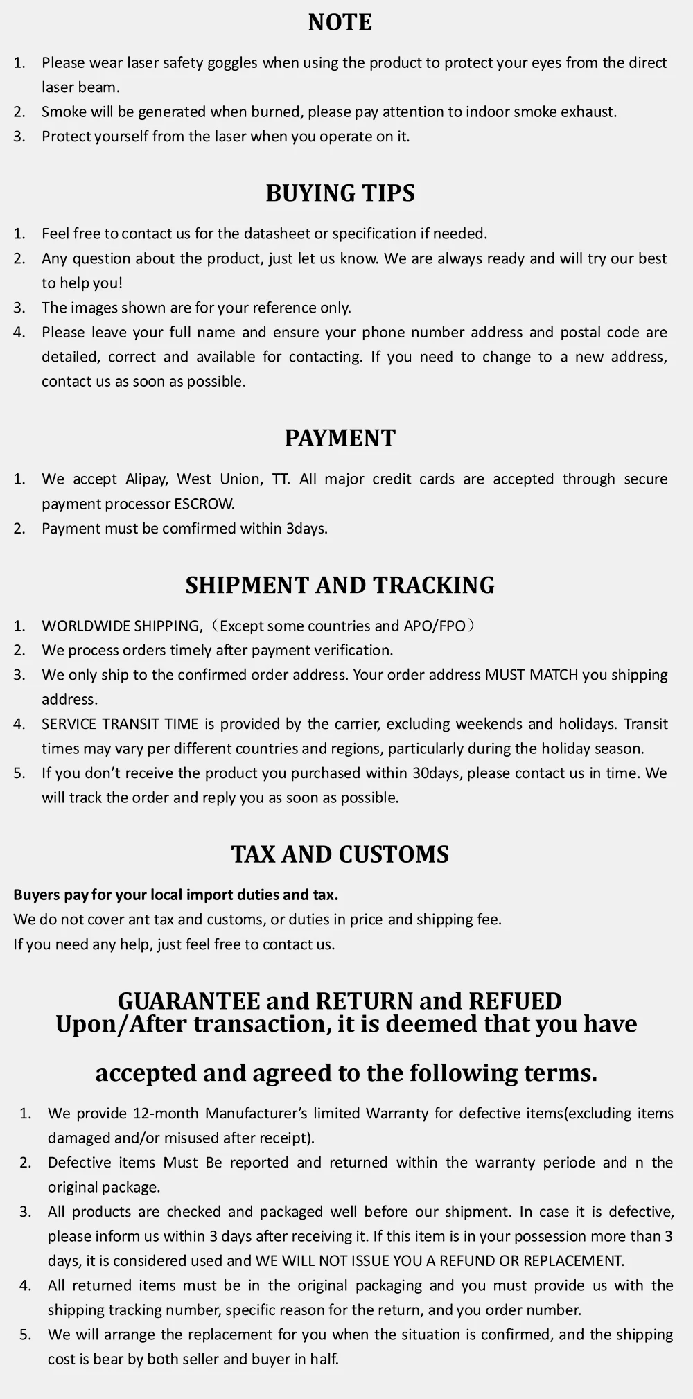 2. Бесплатная доставка не включает таможенные сборы, а также сборы за отдаленные районы. В каждой стране действует соответствующая тарифная политика. Если таможня проводит выборочную проверку, тариф будет оплачиваться покупателем, и я надеюсь на понимание.