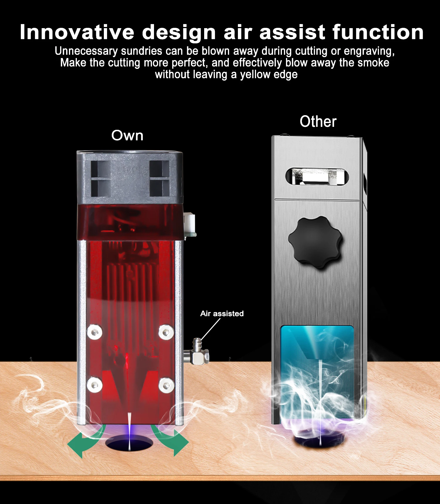 2022 новейший лазерный гравер:A40-это лазерный гравер thenewest, новый дизайн кнопки переключения, более удобный.Лазерный модуль со встроенным воздушным интерфейсом, улучшенным воздушным клапаном, улучшает возможности резки и гравировки, особенно уменьшает желтые края при резке древесины.