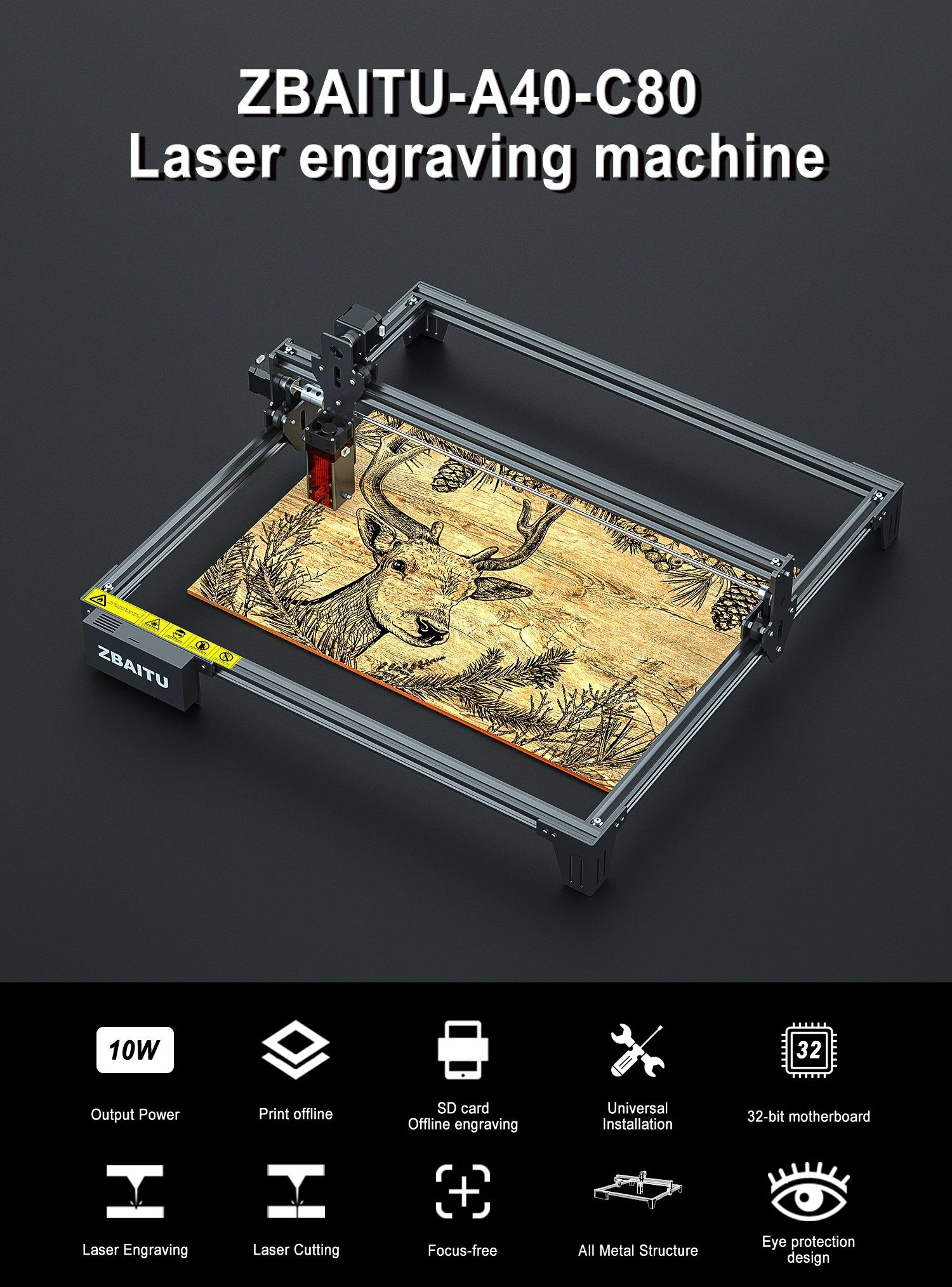Большой размер гравировки и гравировка цилиндрических объектов:40x40 мм интервал гравировки большой площади может удовлетворить ваши различные потребности гравировки. ZBAITU лазерный резак и гравер машина может гравировать цилиндры большого диаметра путем добавления вращающихся вложений и повышения высоты корпуса машины. Раскройте свое творчество на более чем ста материалах, включая бумагу, бамбук, дерево, кожаную печатную плату, оксид алюминия, металл, стекло и т. д.