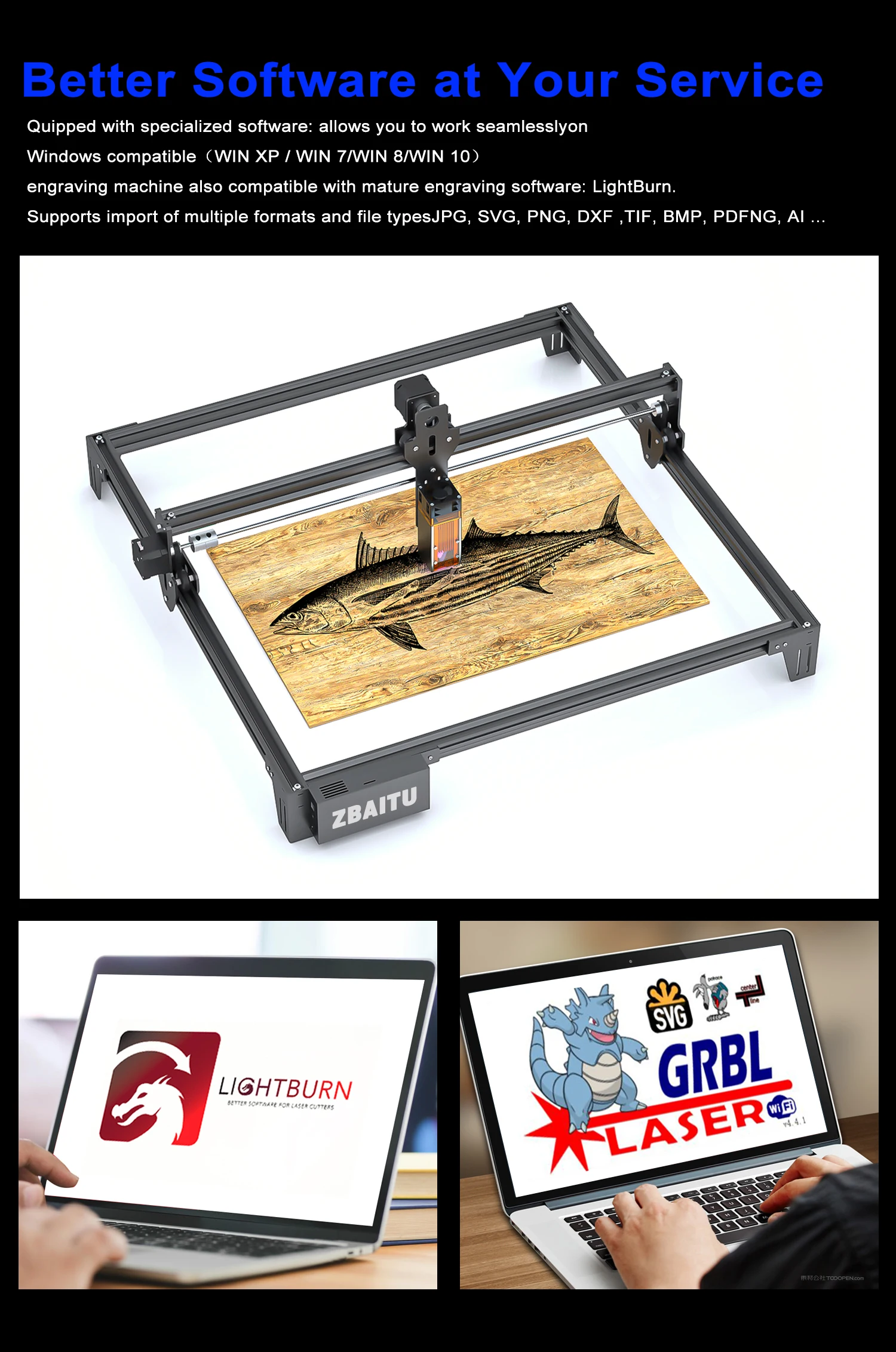 Широкая совместимость:Машина совместима с различными зрелыми гравировальными программами, такими как (LaserGRBL, LightBurn) поддержка Win 7 / Win 8/ Win 10, а также поддерживает систему Mac, формат гравировки файлов поддерживает Совместимость с форматом файлов гравировки с NC, BMP, JPG, PNG , DXF и т. д.