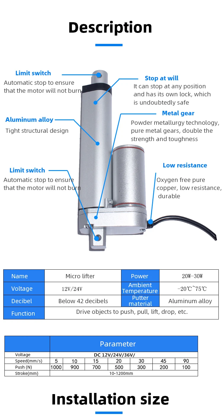 1. Двигатель толкателя имеет встроенный концевой выключатель, который автоматически останавливается в конце/конце (удлиняется до конца/оттягивается до конца), И останавливается, если какой-либо сбой питания в середине.