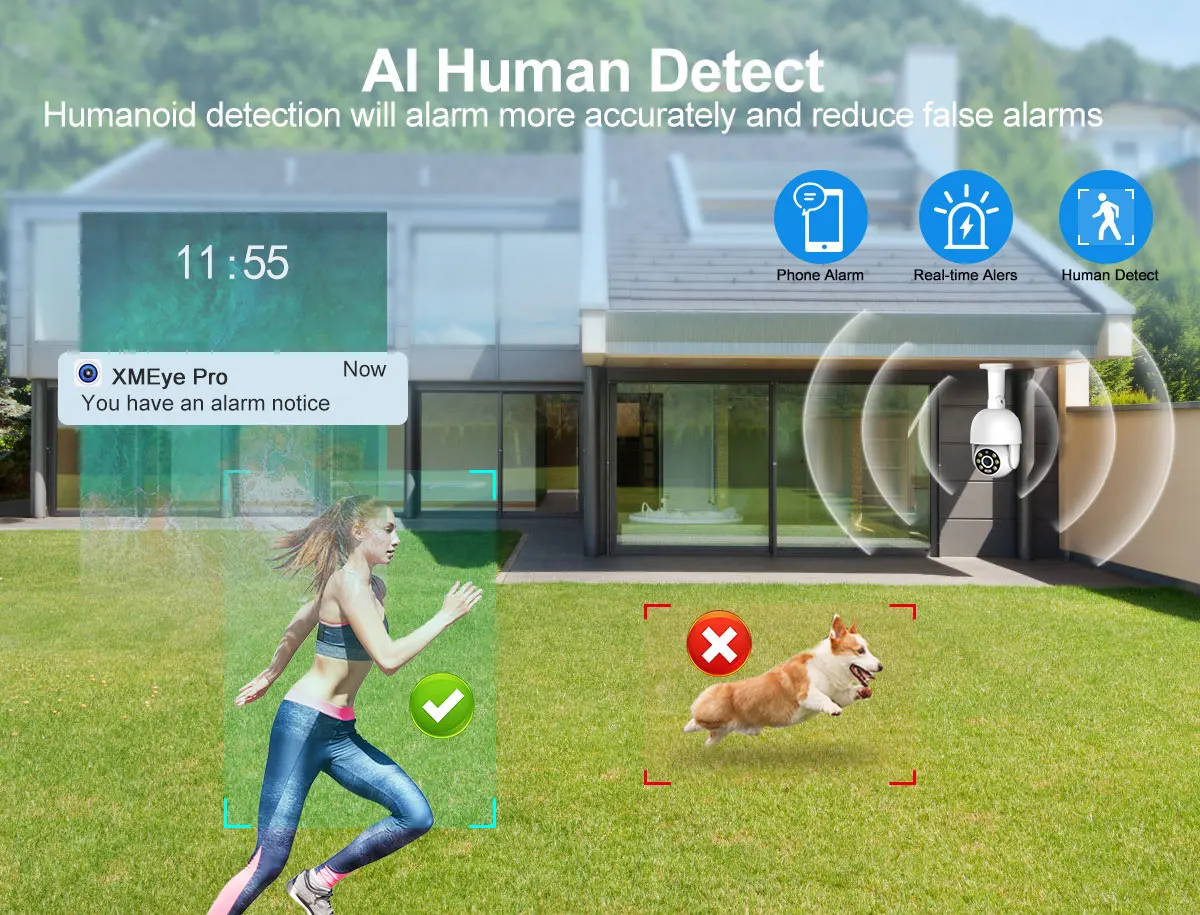 Быстро находит человеческие цели и сразу отправляет уведомление на ваш телефон, позволит вам увидеть, что происходит в любом месте. Он обнаруживает только человеческую форму и не будет ложно запускать предметы, такие как автомобили и деревья.