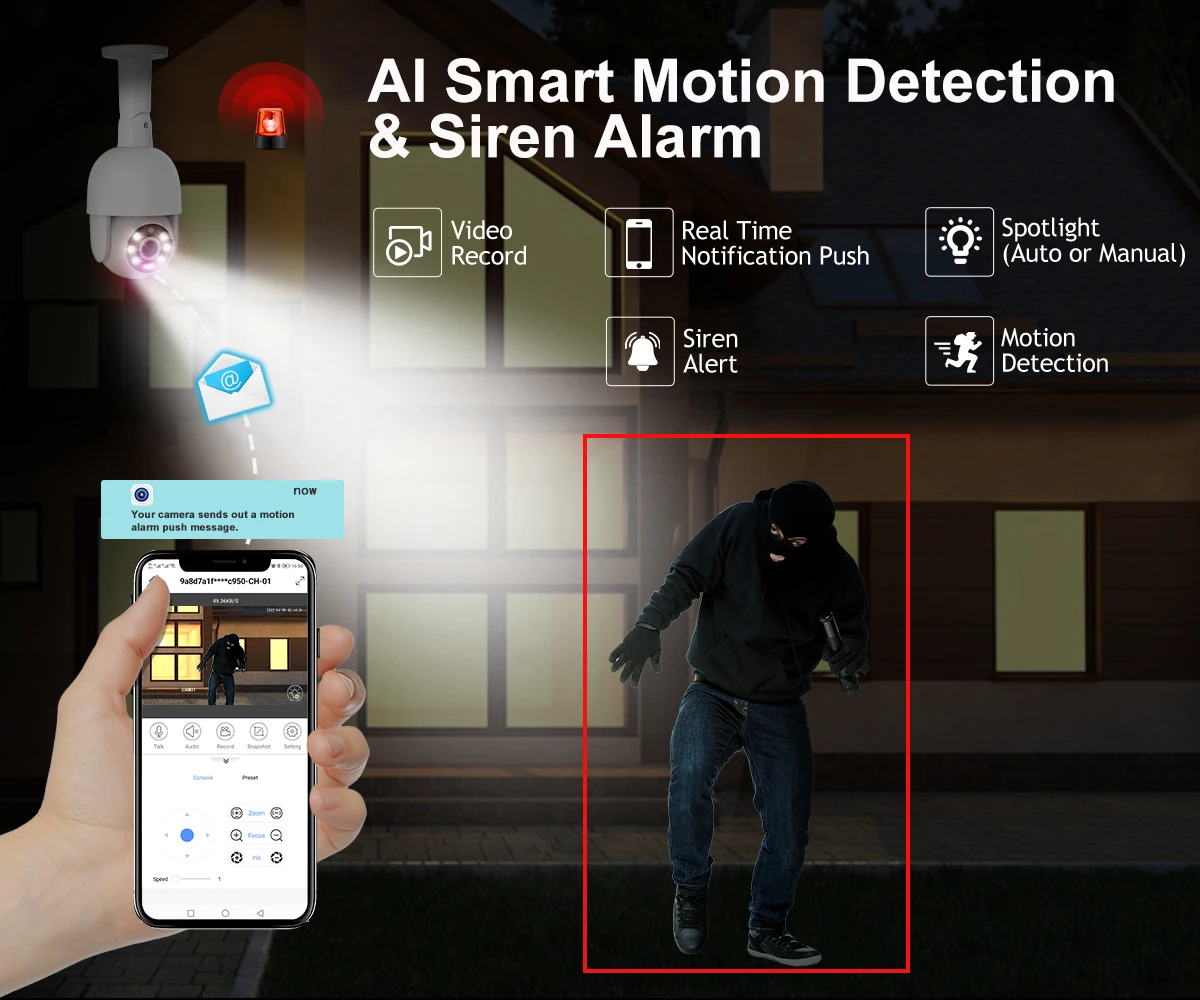 Камера использует новейший алгоритм AI, который может точно обнаруживать движения и отправлять вам уведомления через приложение, поэтому вам не нужно беспокоиться о безопасности вашей зоны обороны