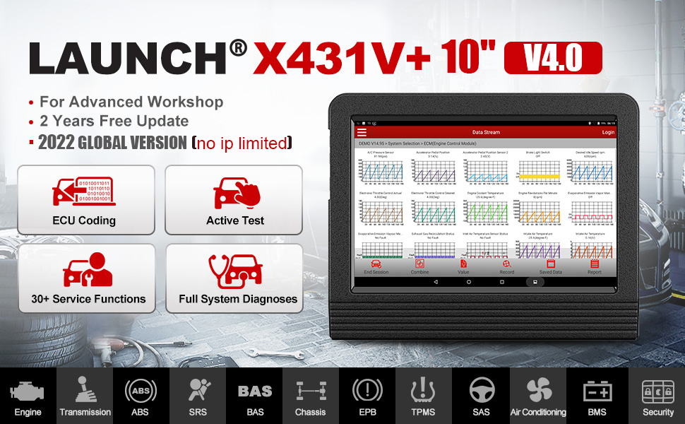 Сопровождение с непрерывным обновлением программного обеспечения и программы LAUNCH X431 V + 4,0, было добавлено больше функций: установка на главный светильник, согласование сидений, исследование инициализации дверей и окон, инициализация Sunroof, соответствие пневматической подвеске, соответствие коробки передач, калибровка инжектора, сброс мультимедийного видео, сброс кластера, сервис иммобилайзера, сброс изменения шин, (В зависимости от конкретных моделей автомобилей, не для всех автомобилей). И все больше и больше функций будут улучшены и оптимизированы.