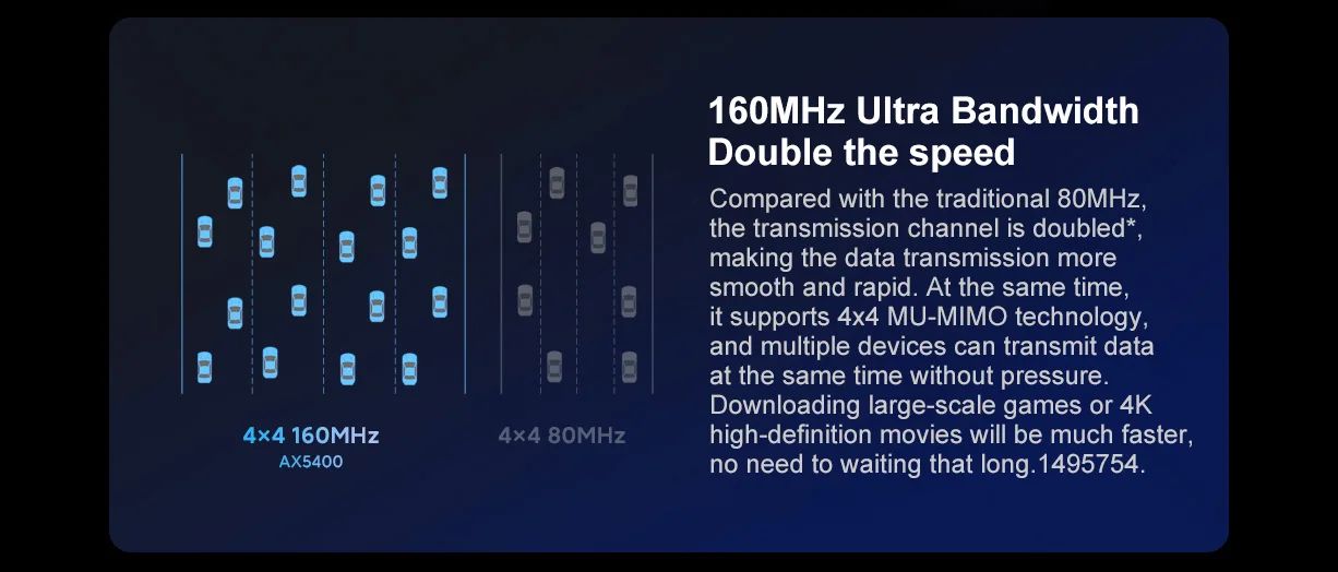По сравнению с традиционной частотой 80 МГц канал передачи увеличивается в два раза *, что делает передачу данных более гладкой и свободной. В то же время, он поддерживает технологию 4x4MU-MIMO, и несколько устройств могут передавать одновременно без давления. Смотрите видео, играйте в игры и одновременно Скачивайте фильмы. Все сделано.