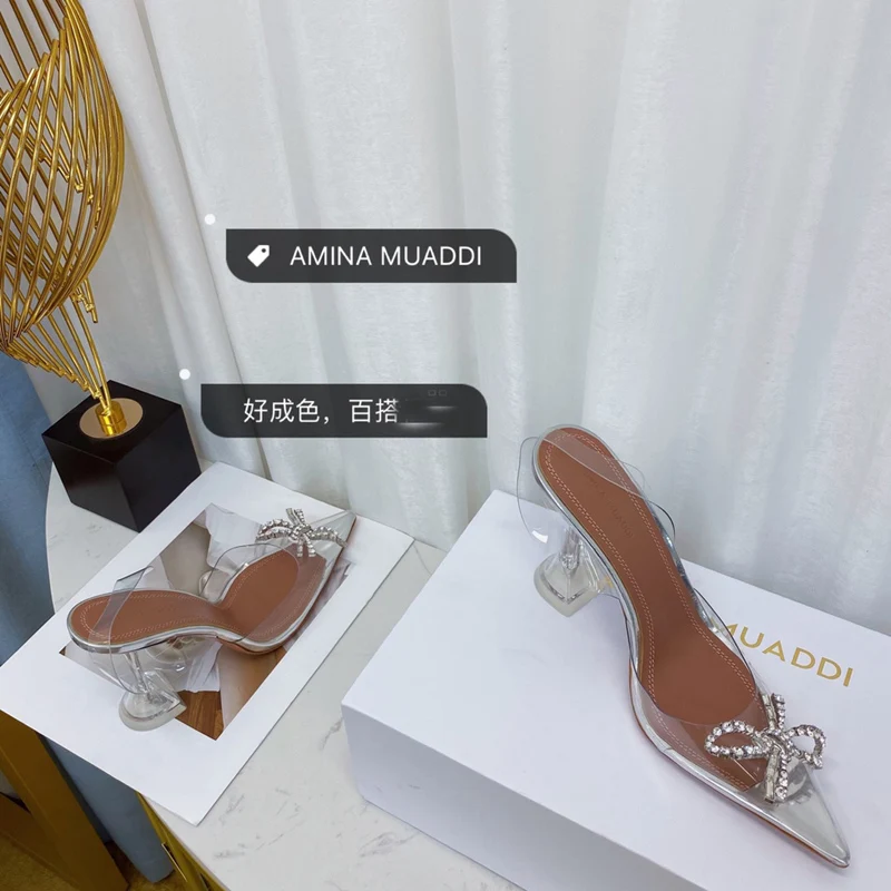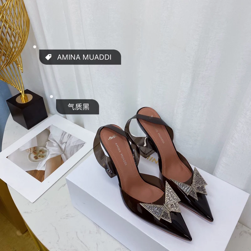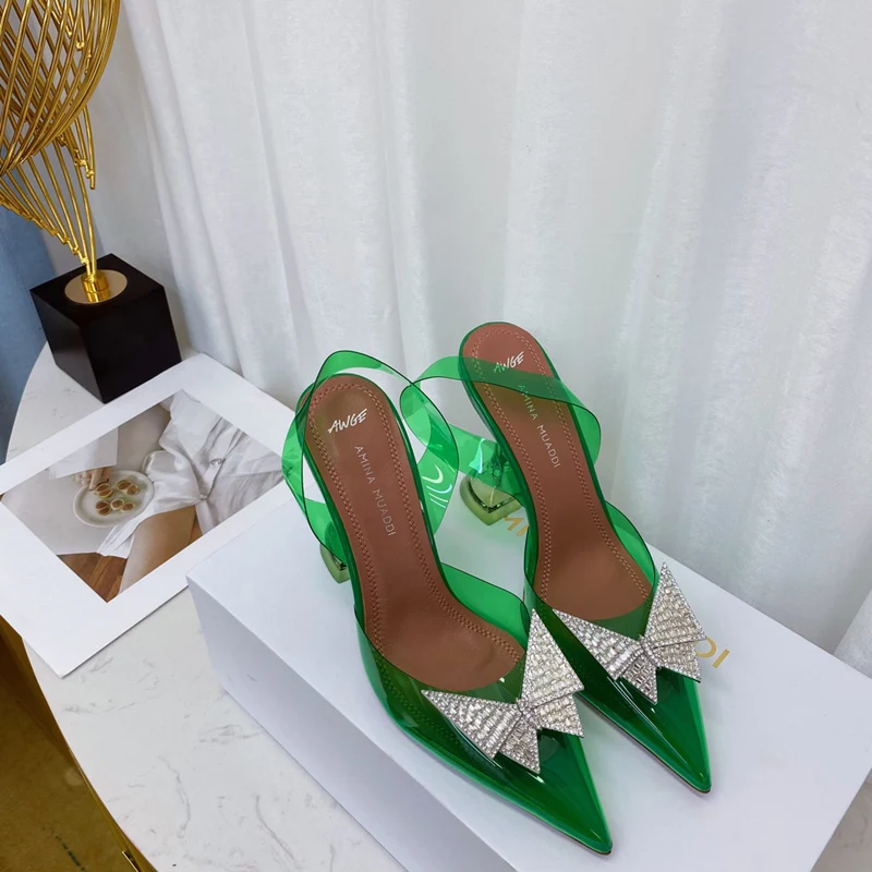 Купить дешевые туфли; Женские вечерние модельные туфли; Туфли-лодочки из прозрачного ПВХ с кожаной отделкой; AMINA MUADDI AWGE; Женские туфли на высоком каблуке