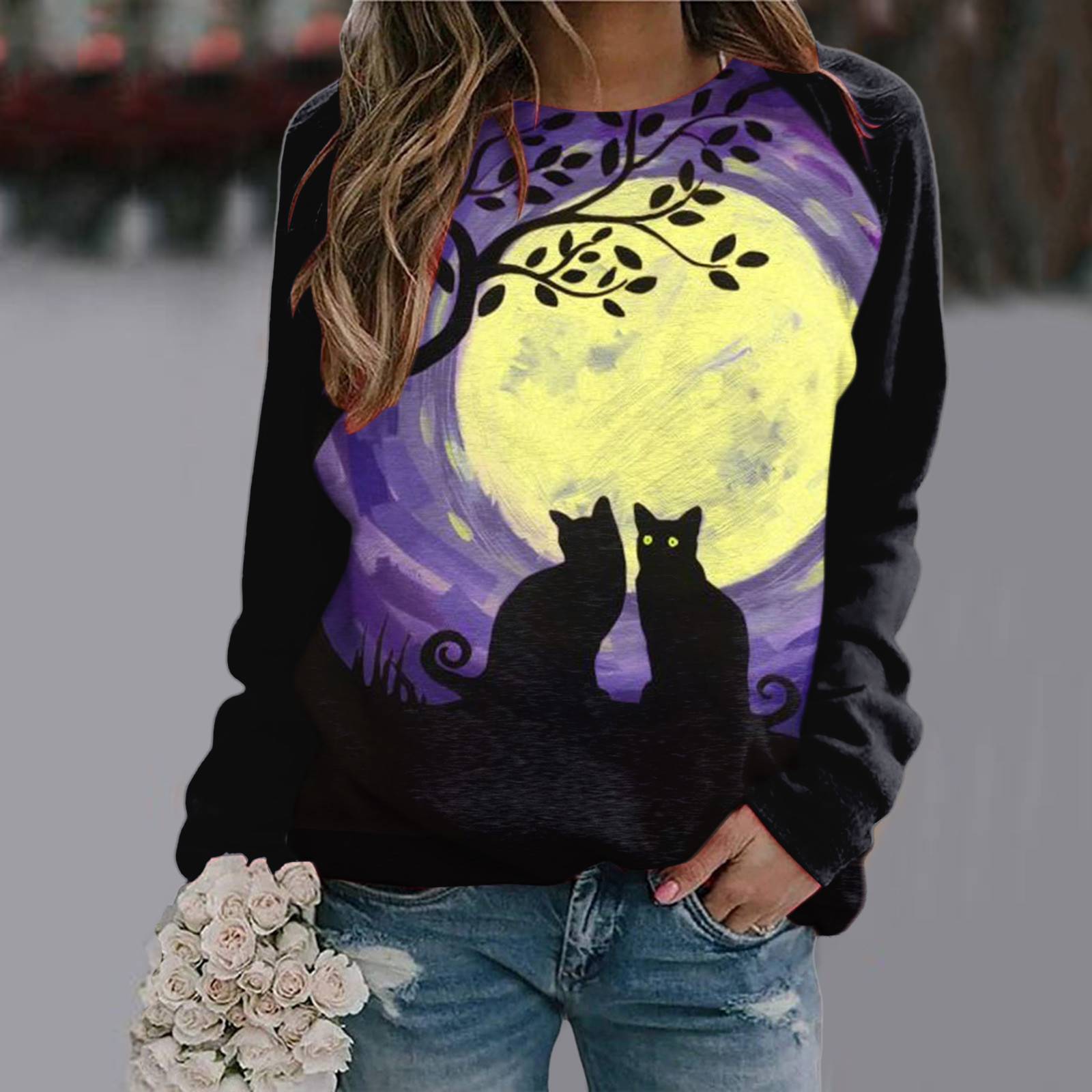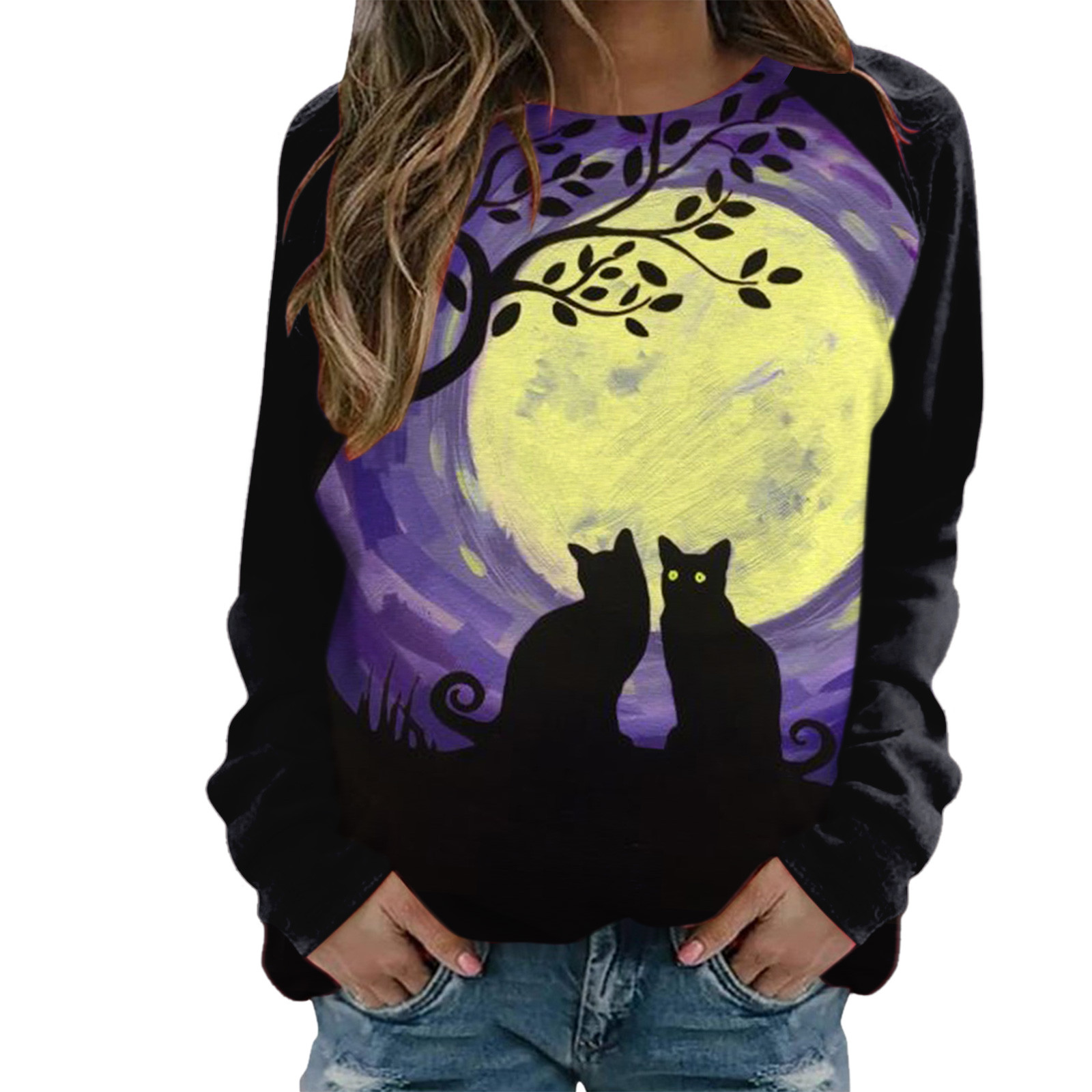 【Особенности: круглый вырез, сплошной цвет, длинные рукава, классический принт, Свободный пуловер с круглым вырезом.