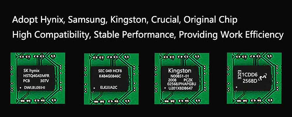 Использование оригинальных чипов Hynix, Samsung, Kingston, высокая совместимость, стабильная производительность, повышение эффективности работы