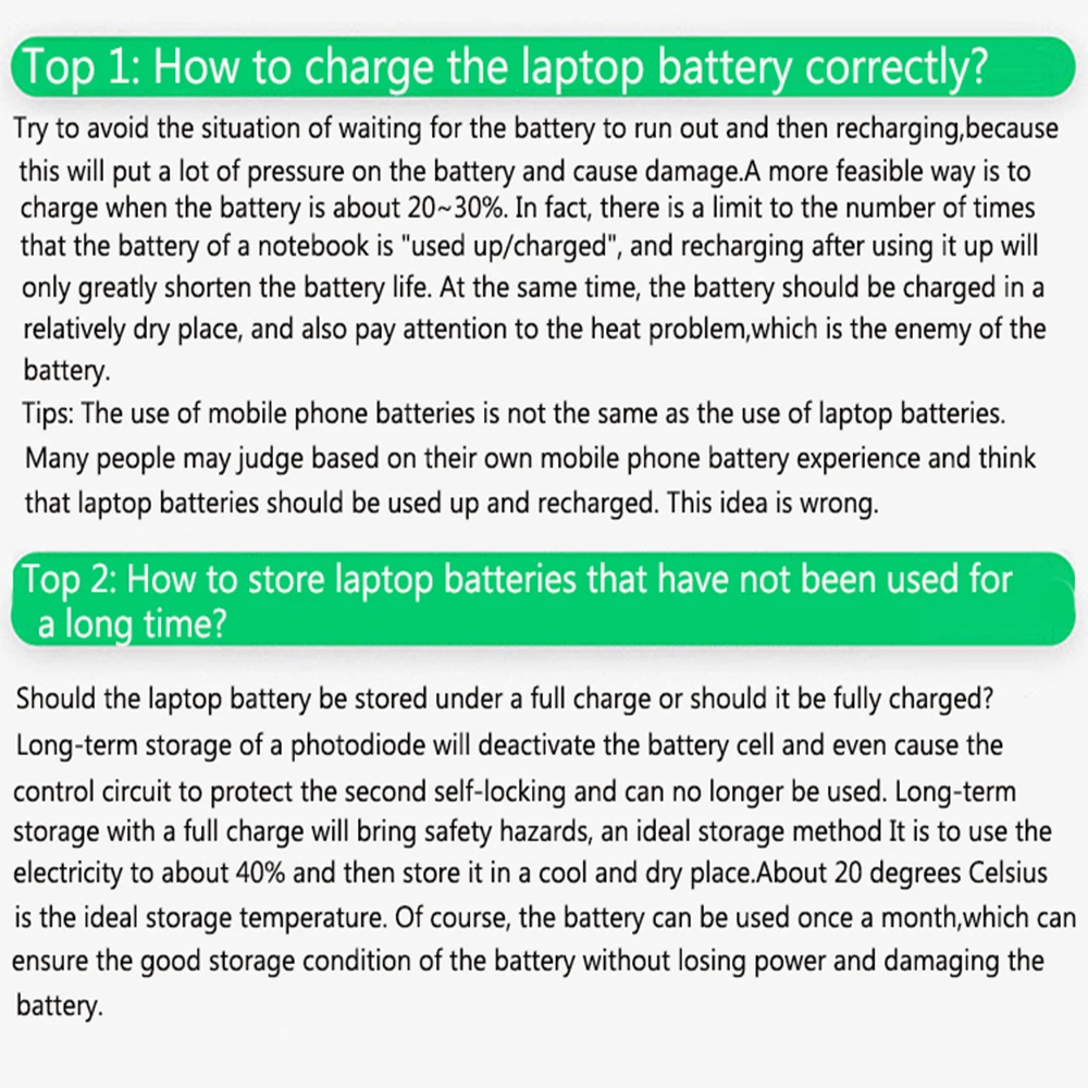 1. When you use the new battery at the first time,Please discharge the battery to 10% of the full charger then charger it to 100% .When a new battery is charged, it should be charged continuously for 12 hours, fully charging. Cycle Three to five times. To wake up the new battery. Turn off the computer while charging, and do not unplug the power during charging.