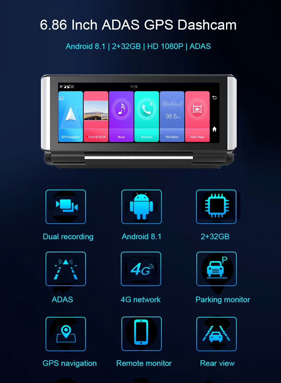 GPS навигация, Автомобильный видеорегистратор, монитор парковки, Bluetooth hands-free, WiFi, fm-передатчик, смарт-устройство с ОС Android 8,1, ADAS,4G интернет-серфинга, удаленный монитор, g-сенсор.