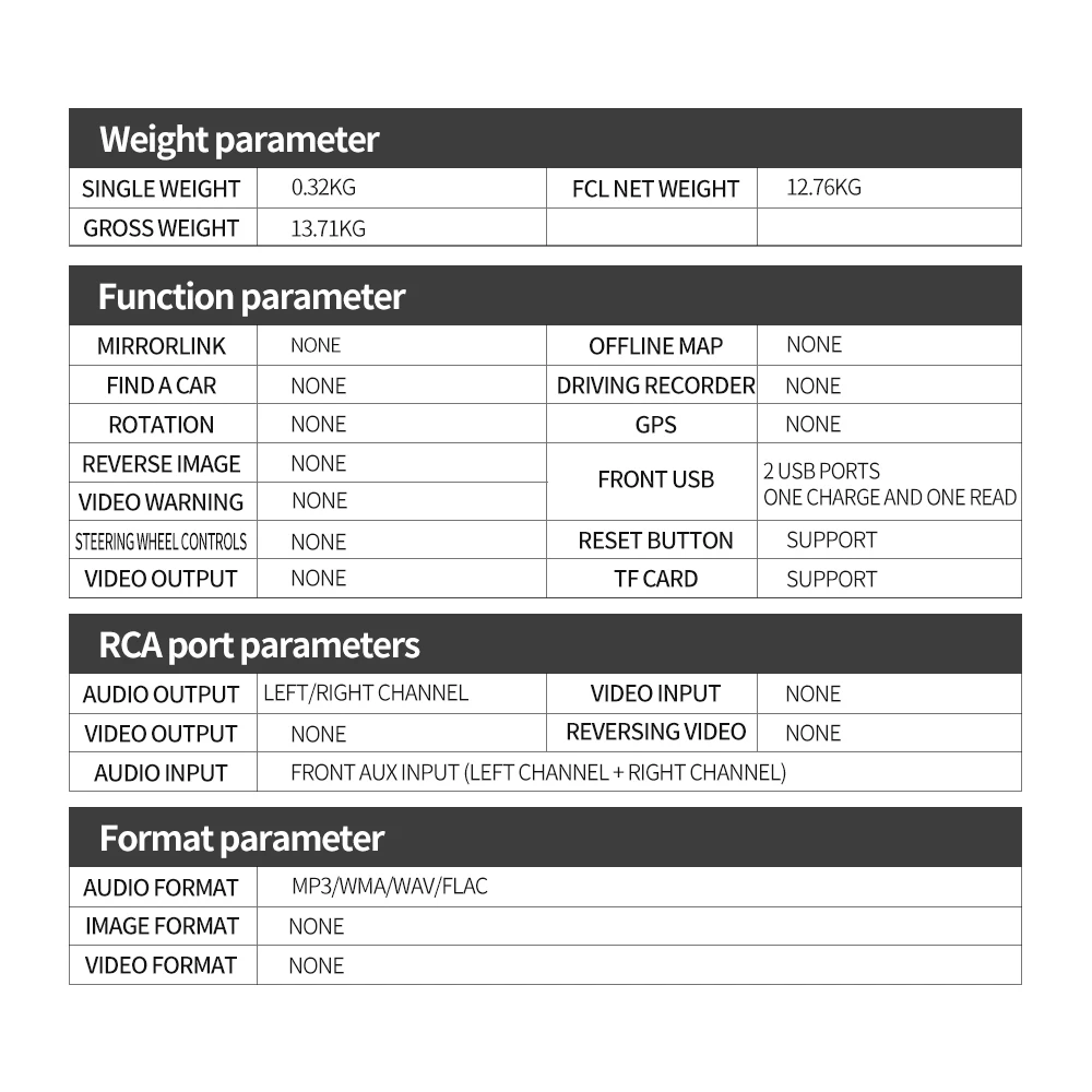 Порт RCA: аудиовыход 2 канала (1 канал левый канал + 1 канал правый канал), передний AUX аудио вход (левый канал + правый канал)