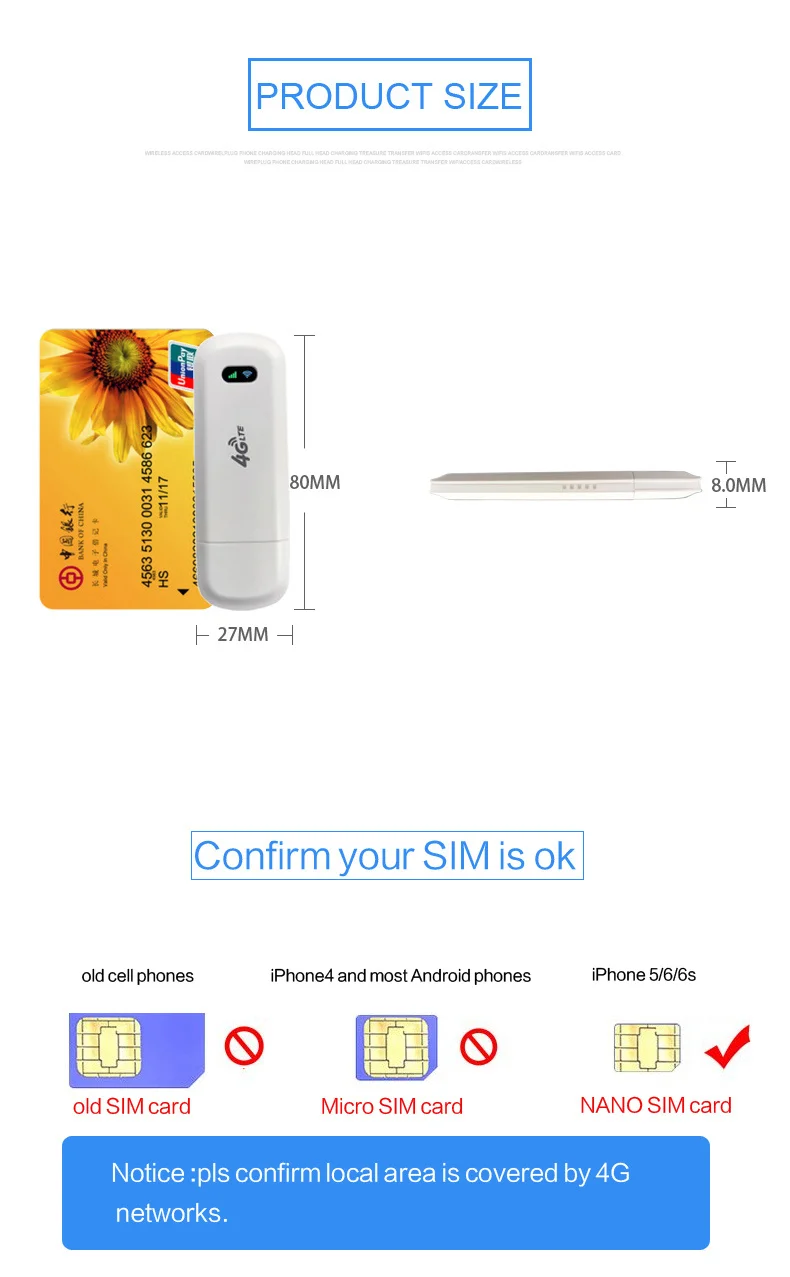 1. Наш 4G Роутер/модем поддерживает только универсальные обычные sim-карты. Для некоторых заблокированных sim-карт, контрактные sim-карты, которые операторы не позволяют использовать на Wi-Fi маршрутизаторах, или только позволяют использовать на своих авторизованных устройствах. Этот продукт может не работать. (Если ваша sim-карта не имеет доступа к Интернету, пожалуйста, не паникуйте. Обычно вы меняете универсальную sim-карту другого оператора, тогда она будет работать. Или вы можете связаться с нами для получения помощи.)