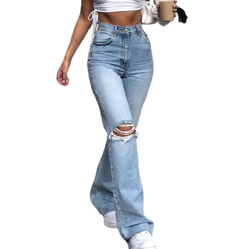 Винтажные Синие рваные мешковатые расклешенные брюки Y2k, женские широкие джинсы с высокой талией Harajuku, уличная одежда для мам и женщин
