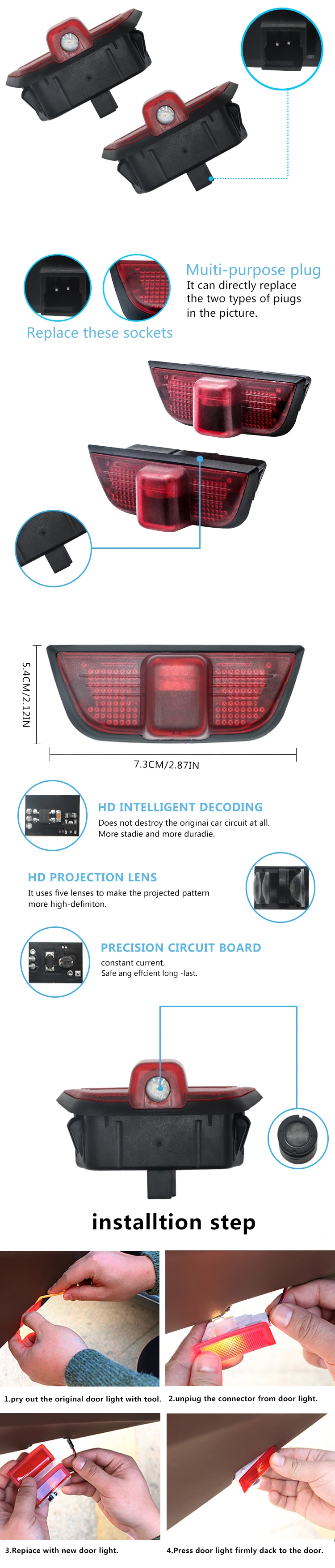 Подходящие модели: Для пары удивительных дверных ступенчатых лазерных прожекторов теней. Когда вы открываете дверь, вы увидите светодиодный светильник, который вас приветствует. Эта мода популярна среди молодых и автолюбителей. Когда дверь закрывается, свет выходит. Характеристики: высокая эффективность и стабильная производительность. Водонепроницаемый и ударопрочный (высокая ударопрочность/вибрация) дизайн. Отличный светодиодный чип. Отсутствие загрязнения, отсутствие шума, отсутствие электронных помех. Легко установить: непосредственно заменить оригинальный дверной светильник, нет необходимости сверлить отверстие, без проводов.