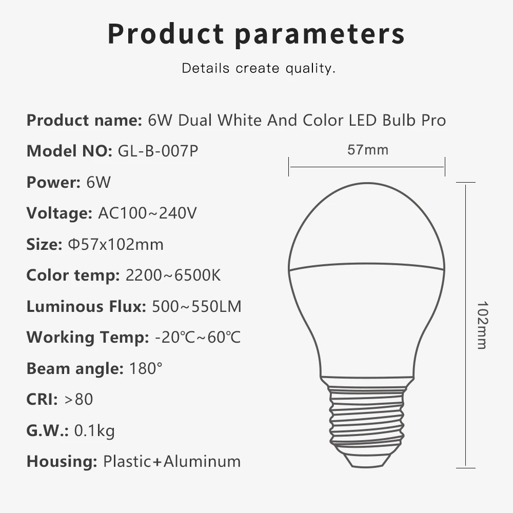 Срок службы: 50000 часовМаксимальный диаметр: 57 ммМаксимальная длина: 102 ммЦветовая температура: 2200-6500KСветовой поток: 500LM-550LMСветоотдача: 90 лм/ВтCRI: >80