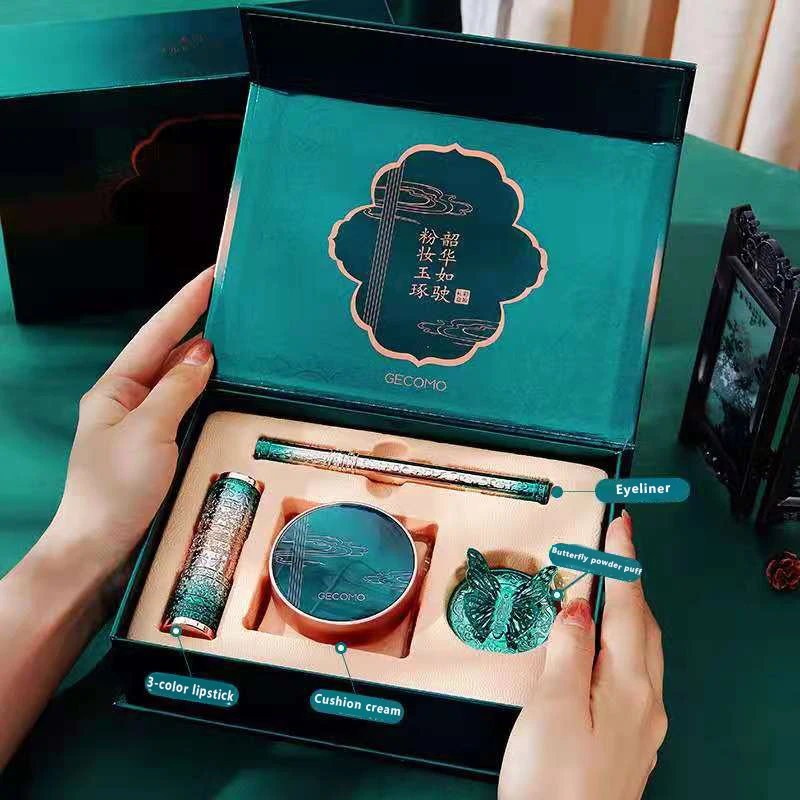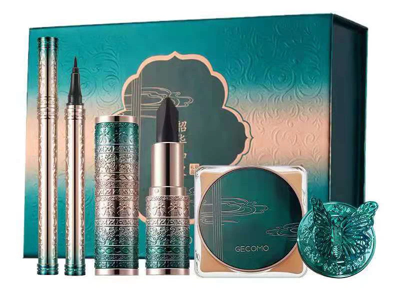 Yuzhuo 4-х частей набор для макияжа, на каждый день, 3 цвета помада для губ, подводка для глаз и подушки BB крем с принтом «бабочка» пуховка, high-end, превосходный набор в подарочной коробке