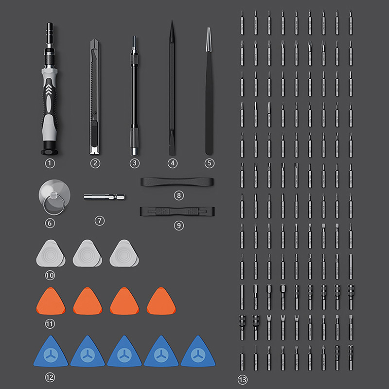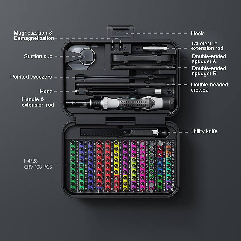 Этот набор отверток оснащен 108 CRV битами, все из которых являются широко используемыми битами, которые могут удовлетворить различные ежедневные потребности в разборке и сборке.
