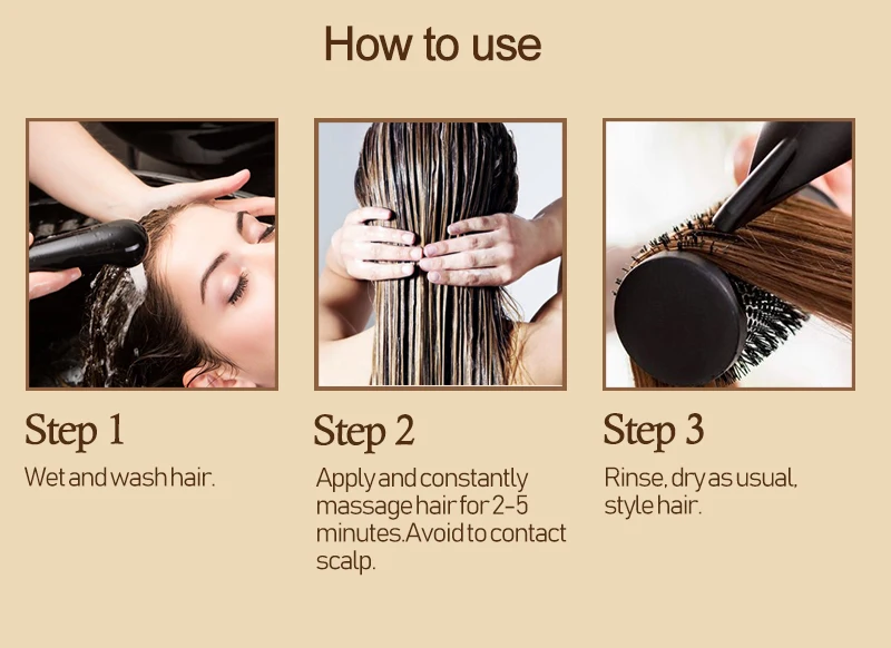 Нанесите маску для волос на волосы, не прикасайтесь к коже головы, постоянно массируйте волосы в течение 2-5 минут