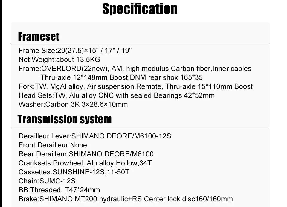 Спецификация:Полная подвеска горный велосипед/Горные Горный велосипед/Двойная подвеска велосипед/deore 12S подвеска велосипеды
