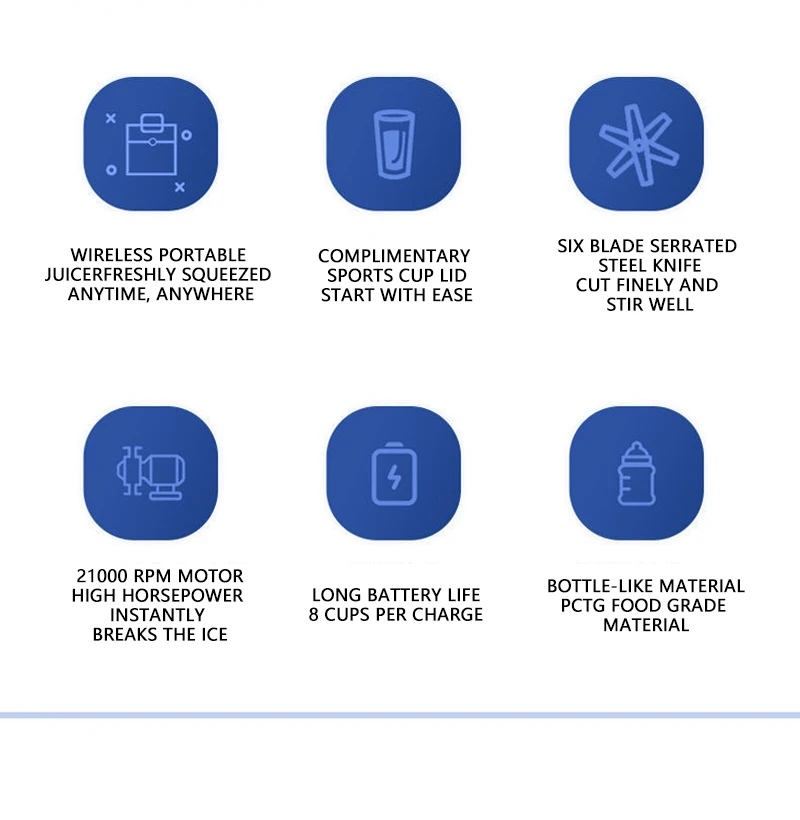 1. Изготовлено из пищевых и нетоксичных материалов. Мини, удобный, это легкий, цельный, беспроводной блендер, который служит в качестве контейнера для напитков.