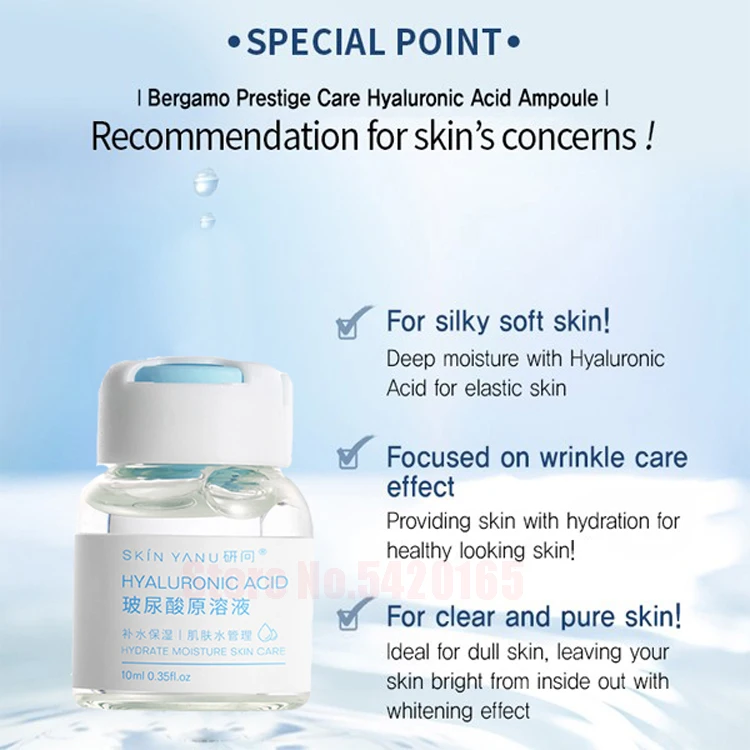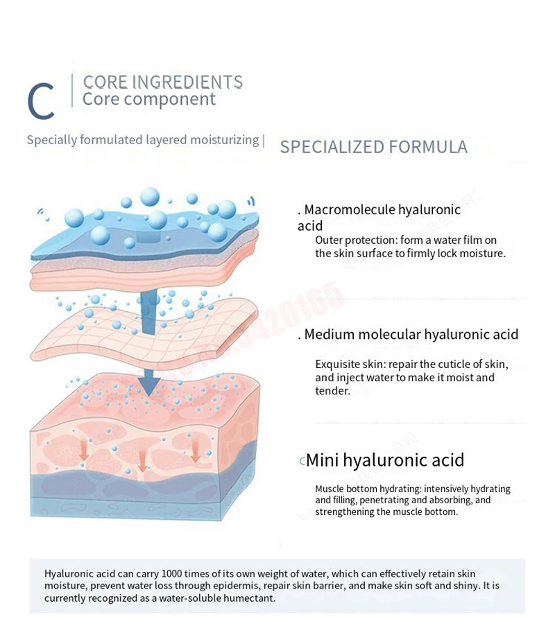 Гиалуроновая кислота может переносить 1000 раз собственного веса воды, что позволяет эффективно удерживать влагу кожи, предотвращает потерю воды через эпидермис, восстанавливает барьер кожи и делает кожу мягкой и блестящей. В настоящее время он признан водорастворимым увлажнителем.